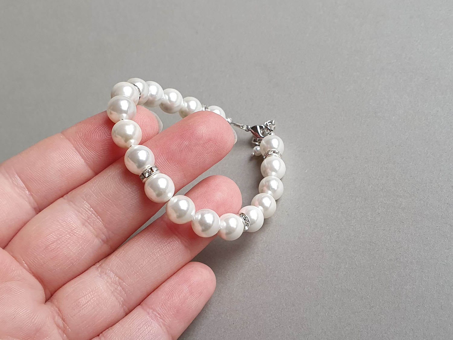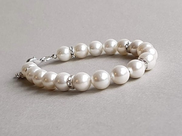 Brățară realizată manual din elemente din argint, elemente placate cu argint, elemente Swarovski şi perle Swarovski de 8 mm. Disponibilă și în varianta cu elemente placate cu aur galben sau aur roz. Mai multe informații despre perle găsiți aici.