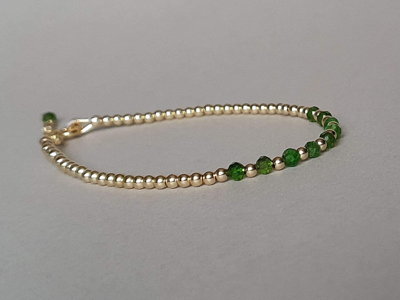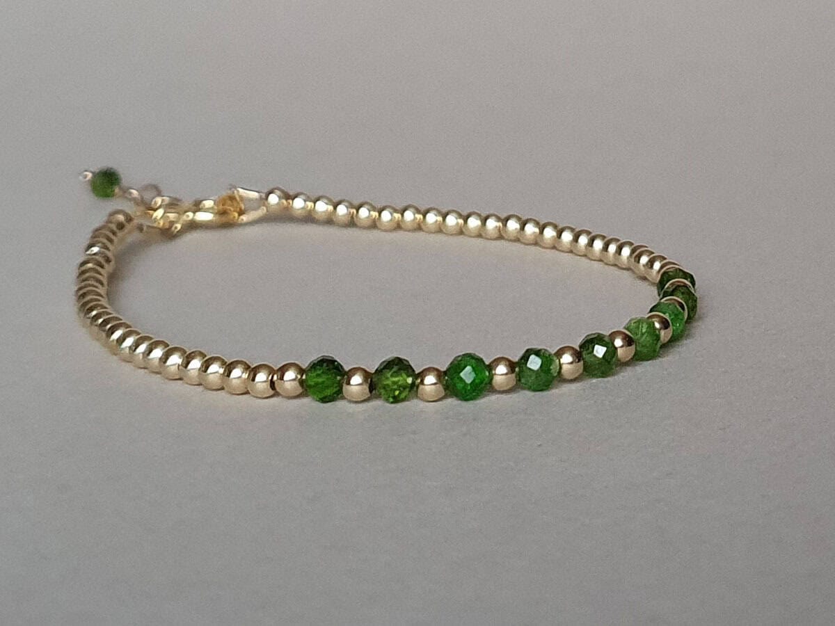 Brățară realizată din aur filat şi rondele fațetate de 3 mm din cromdiopsid natural, netratat termic. Disponibilă și în varianta cu argint sau aur filat roz. Mai multe informații despre aurul filat (gold filled) găsiți aici. La plasarea comenzii, vă rugăm să alegeți din meniu circumferința încheieturii mâinii, măsurată strâns, conform instrucțiunilor de aici.