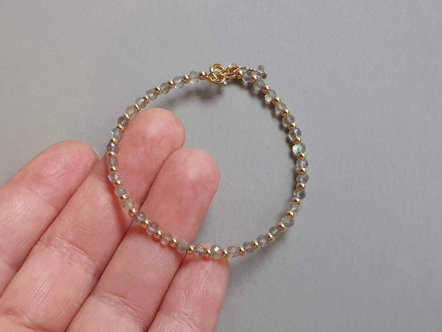 Brățară realizată din aur filat și rondele fațetate de aproximativ 3-3,5 mm din labradorit natural, netratat termic. Mai multe informaţii legate de aurul filat găsiţi aici. Disponibilă și în varianta cu argint.