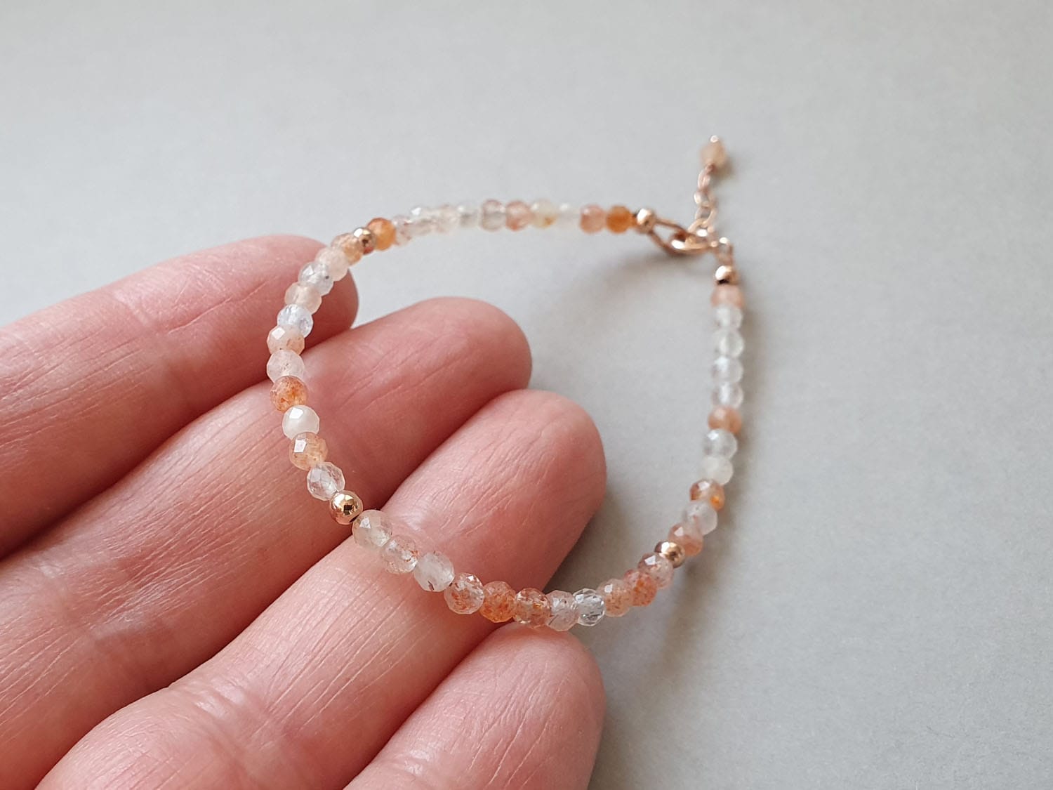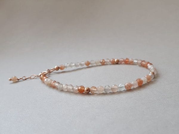Brățară realizată din aur filat și rondele fațetate de aproximativ 3 mm din piatra soarelui (sunstone) naturală, netratată termic. Disponibilă și în varianta cu argint sau aur filat roz. Mai multe informații legate de aurul filat găsiți aici.