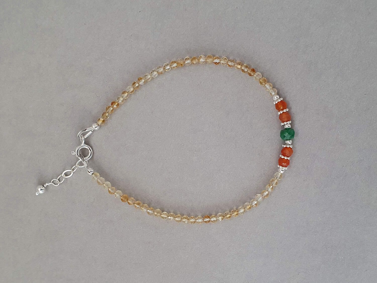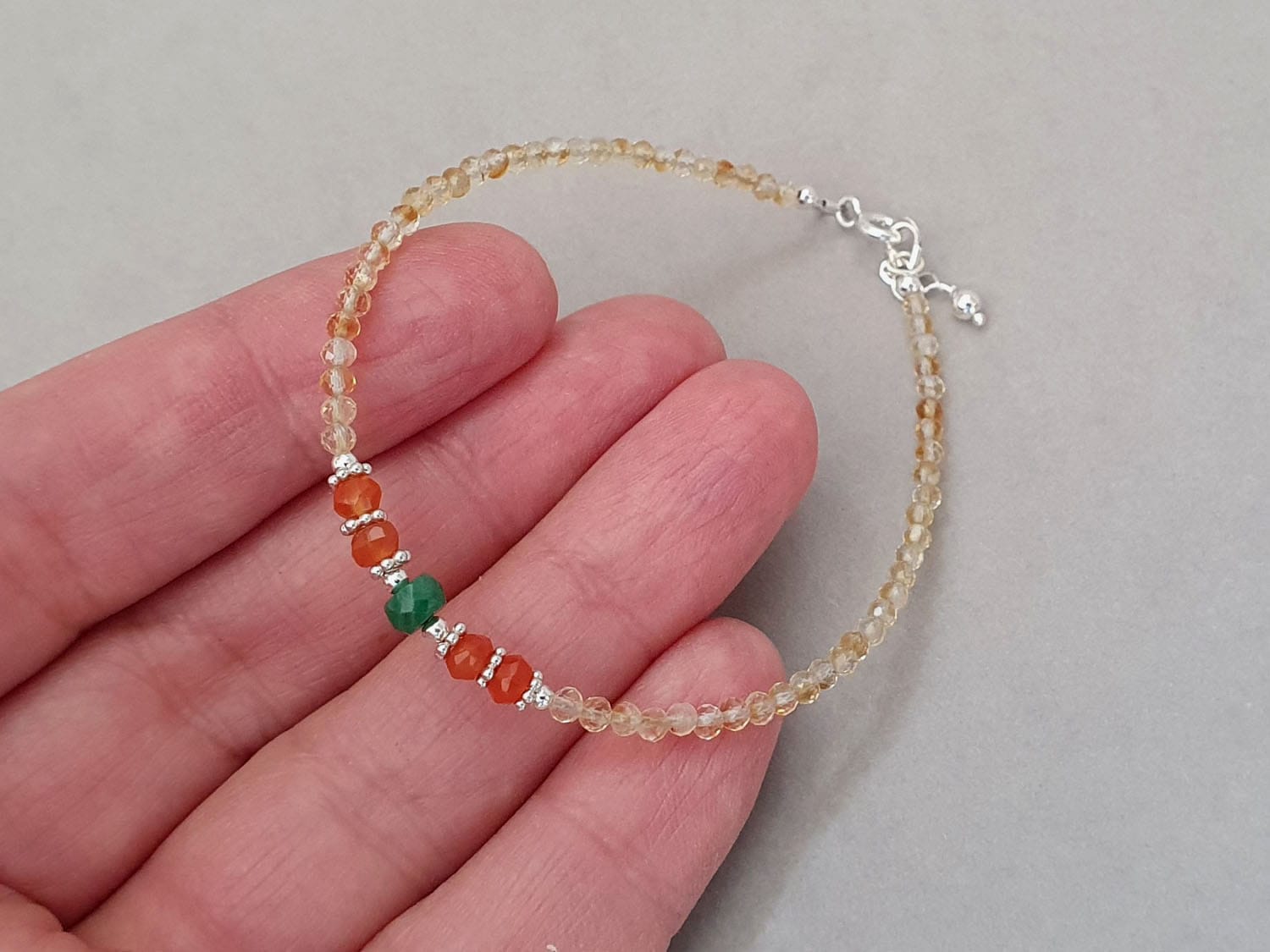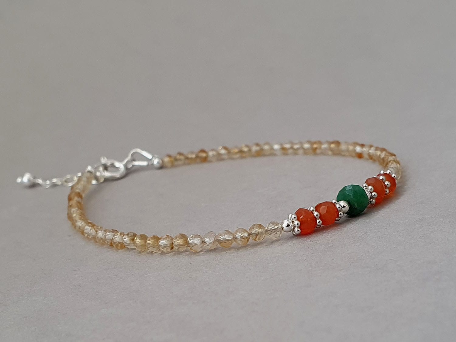 Brățară realizată din argint, rondele fațetate de 2,5-2,7 mm din citrin și carneol naturale, netratate termic și smarald rădăcină natural, vopsit și tratat cu ulei pentru intensificarea culorii. Mai multe informații despre acest tip de smarald găsiți aici. Disponibilă și în varianta cu aur filat galben și argint placat cu aur galben. Mai multe informații despre aurul filat (gold filled) găsiți aici.