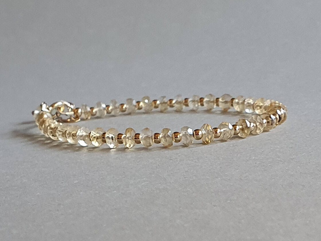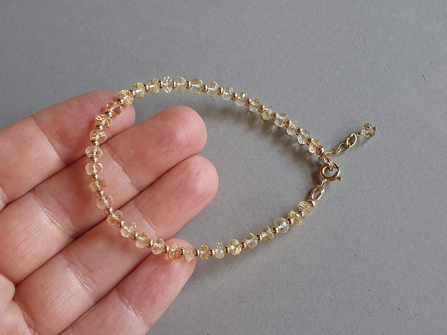 Brățară realizată din aur filat și rondele fațetate de aproximativ 2,5-2,7 mm din citrin natural, netratat termic. Disponibilă și în varianta cu argint. Mai multe informații legate de aurul filat (gold filled), aici.