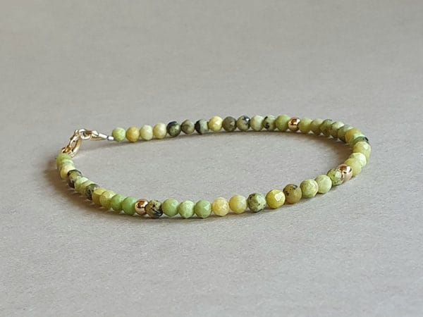 Brățară realizată din aur filat și rondele fațetate de 3 mm din crisopraz natural, netratat termic. Disponibilă și în varianta cu aur filat roz sau argint. Mai multe informații legate de aurul filat găsiți aici.