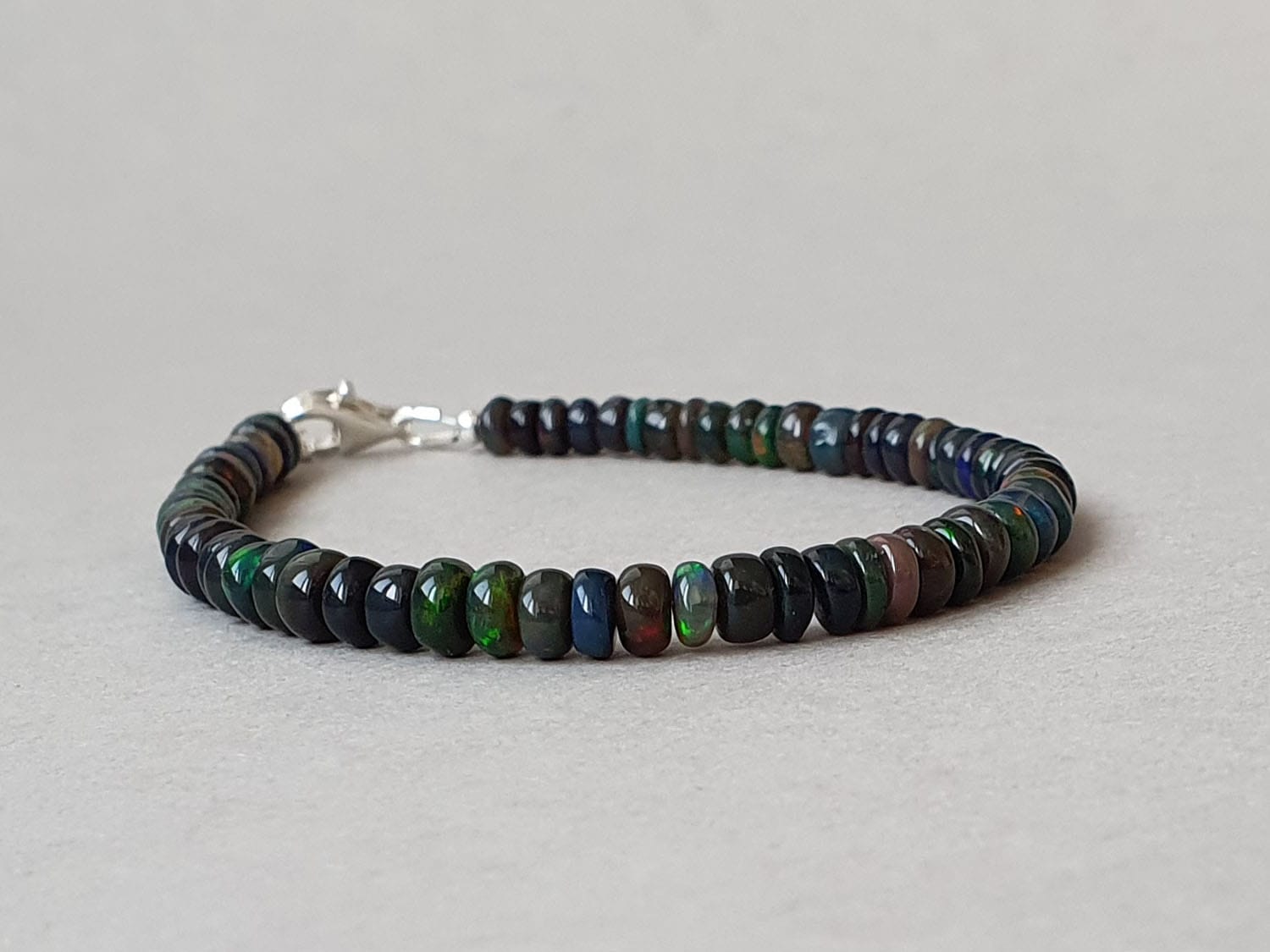 Brățară realizată din argint și rondele de 4-6 mm din opal negru natural, netratat termic. Disponibilă și în varianta cu aur filat galben sau roz. Mai multe informații despre aurul filat (gold filled) găsiți aici.