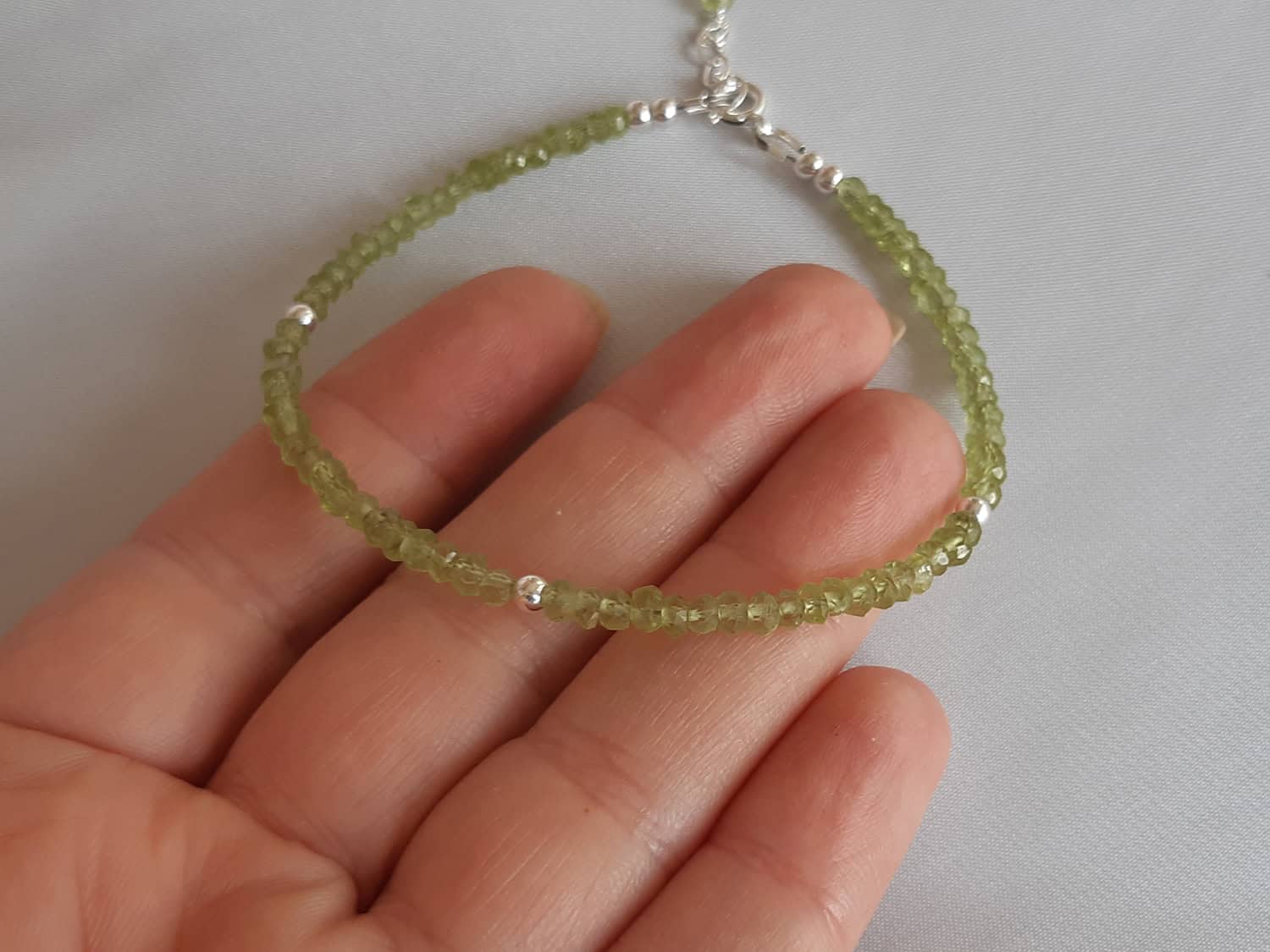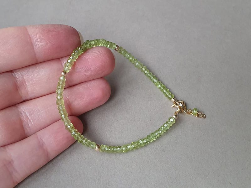 Brățară realizată din aur filat și rondele fațetate de 3 mm din peridot natural, netratat termic. Mai multe informații legate de aurul filat (gold filled), aici. Disponibilă și în varianta cu argint.