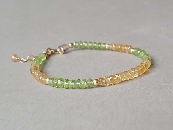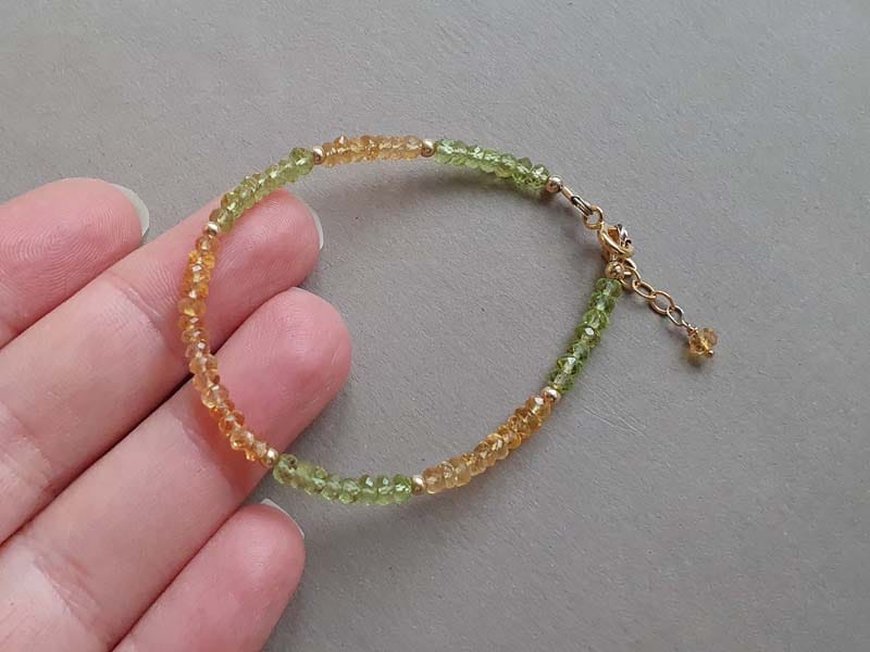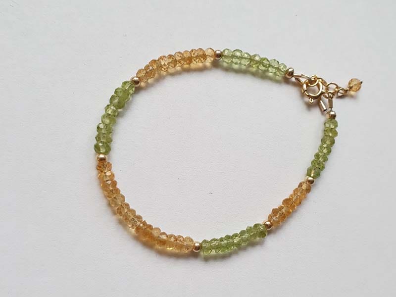 Brățară realizată din aur filat galben și rondele fațetate de 2,5-3 mm din peridot și citrin naturale, netratate termic. Disponibilă și în varianta cu aur filat roz sau argint. Mai multe informații legate de aurul filat (gold filled), aici. La plasarea comenzii, vă rugăm să alegeți din meniu circumferința încheieturii mâinii, măsurată strâns, conform instrucțiunilor de aici.