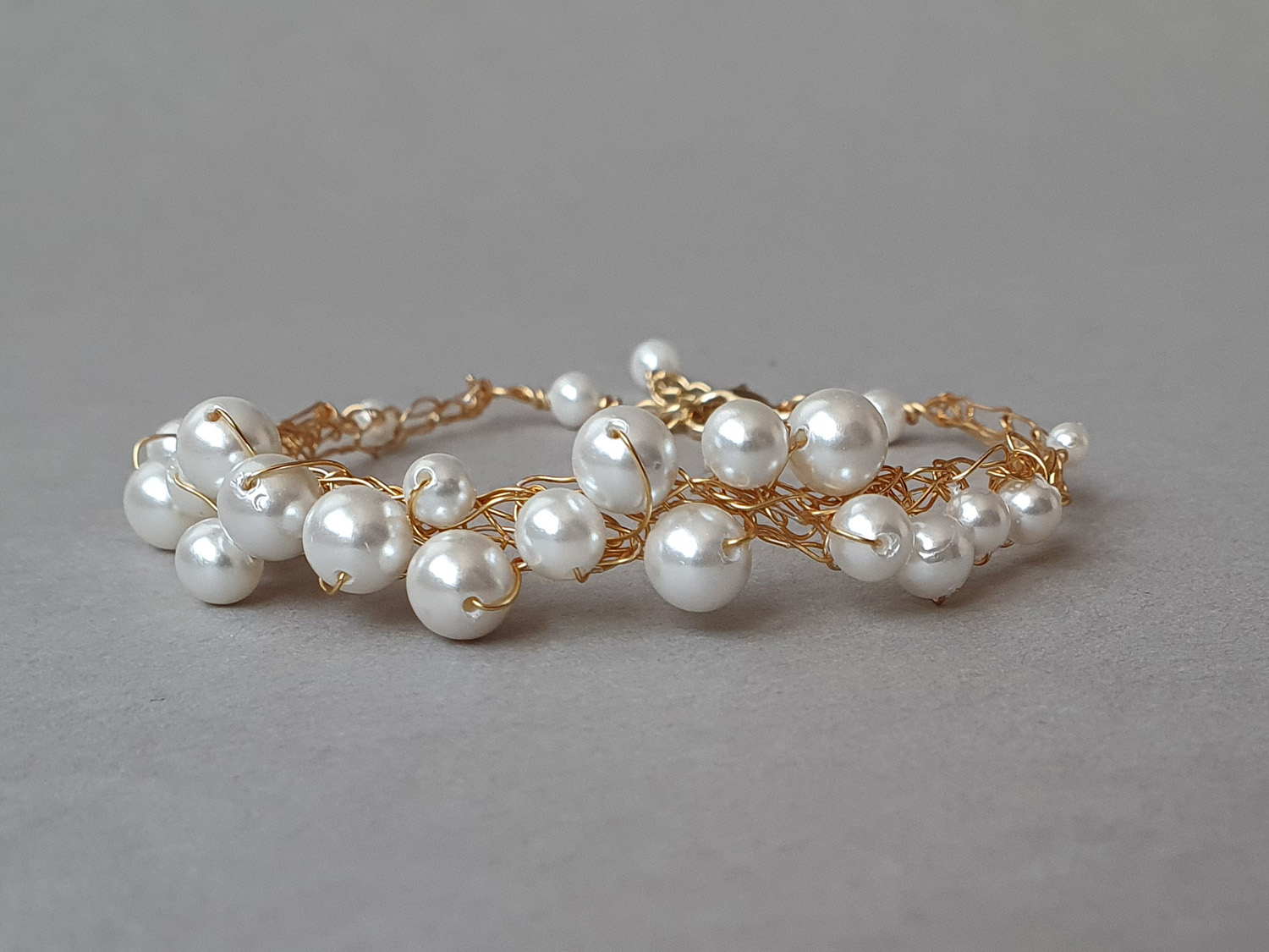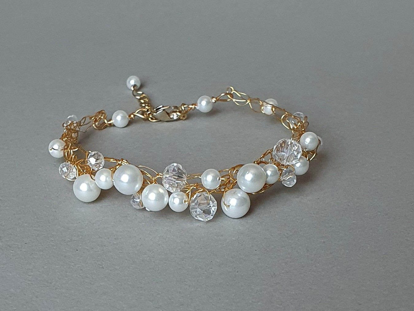 Brățară realizată din fir metalic placat cu aur, cristale din sticlă și perle din sidef. Mai multe informații legate de aurul filat găsiți aici. Disponibilă și în varianta placată cu argint. De asemenea, poate fi realizată doar cu perle (fără cristale).
