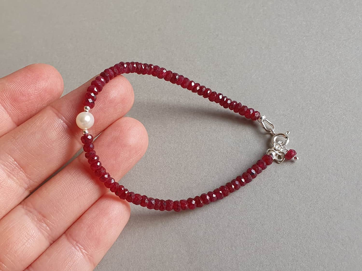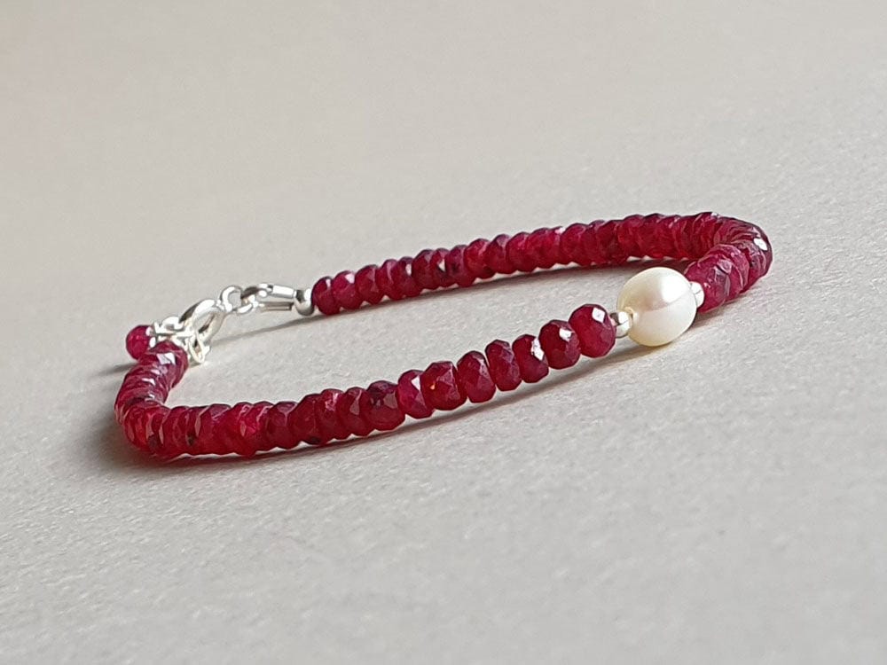 Brățară realizată din argint, o perlă de cultură și rondele fațetate de aproximativ 3-3,5 mm din rubin rădăcină natural, vopsit și tratat cu ulei pentru intensificarea culorii. Mai multe informații despre acest tip de rubin găsiți aici. Disponibilă și în varianta cu aur filat galben sau roz. Mai multe informații despre aurul filat (gold filled) găsiți aici.