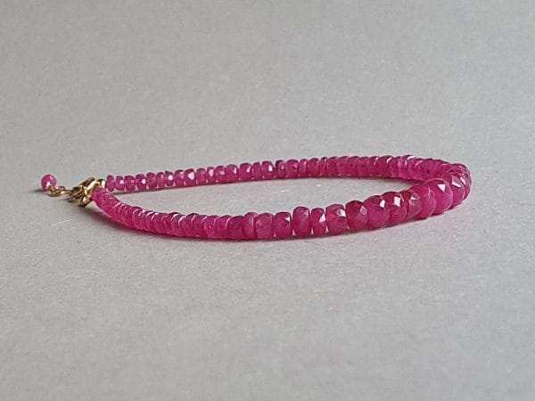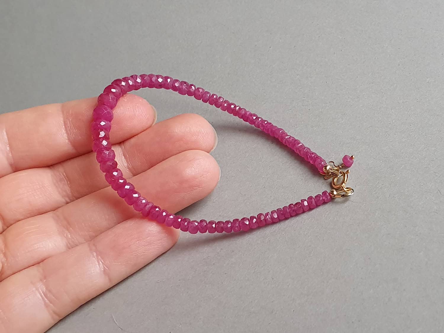 Brățară realizată din aur filat și rondele fațetate de 3-6 mm din rubin prețios, natural, netratat termic. Disponibilă și în varianta cu argint. Mai multe informații despre aurul filat (gold filled) găsiți aici.