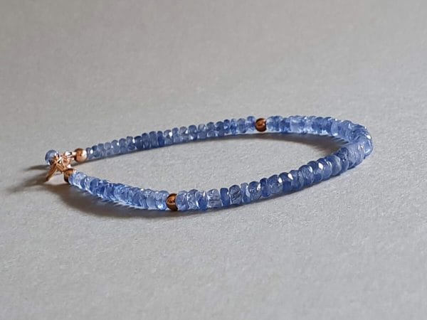 Brățară realizată din aur filat roz și rondele fațetate de 4-5 mm din safir de Burma, natural, netratat termic. Disponibilă și în varianta cu argint. Mai multe informații legate de aurul filat (gold filled), aici.