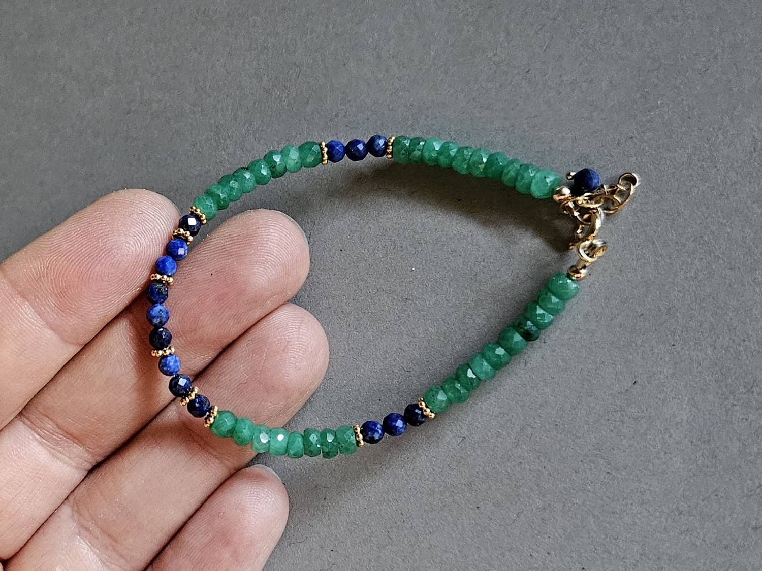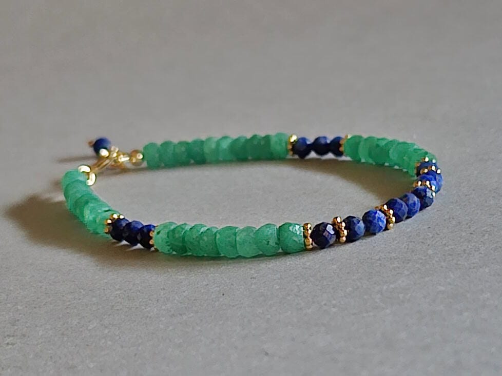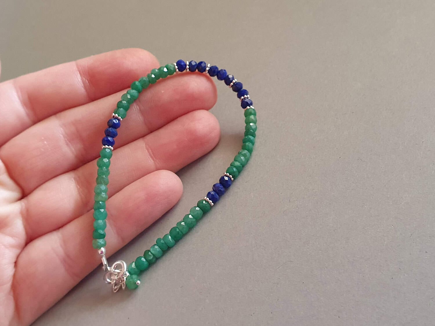 Brățară realizată din argint și rondele fațetate de aproximativ 3-3,5 mm din lapis lazuli natural, netratat termic și smarald rădăcină natural, vopsit și tratat cu ulei pentru intensificarea culorii. Mai multe informații despre acest tip de smarald găsiți aici. Disponibilă și în varianta cu aur filat și argint placat cu aur. Mai multe informații despre aurul filat (gold filled) găsiți aici.