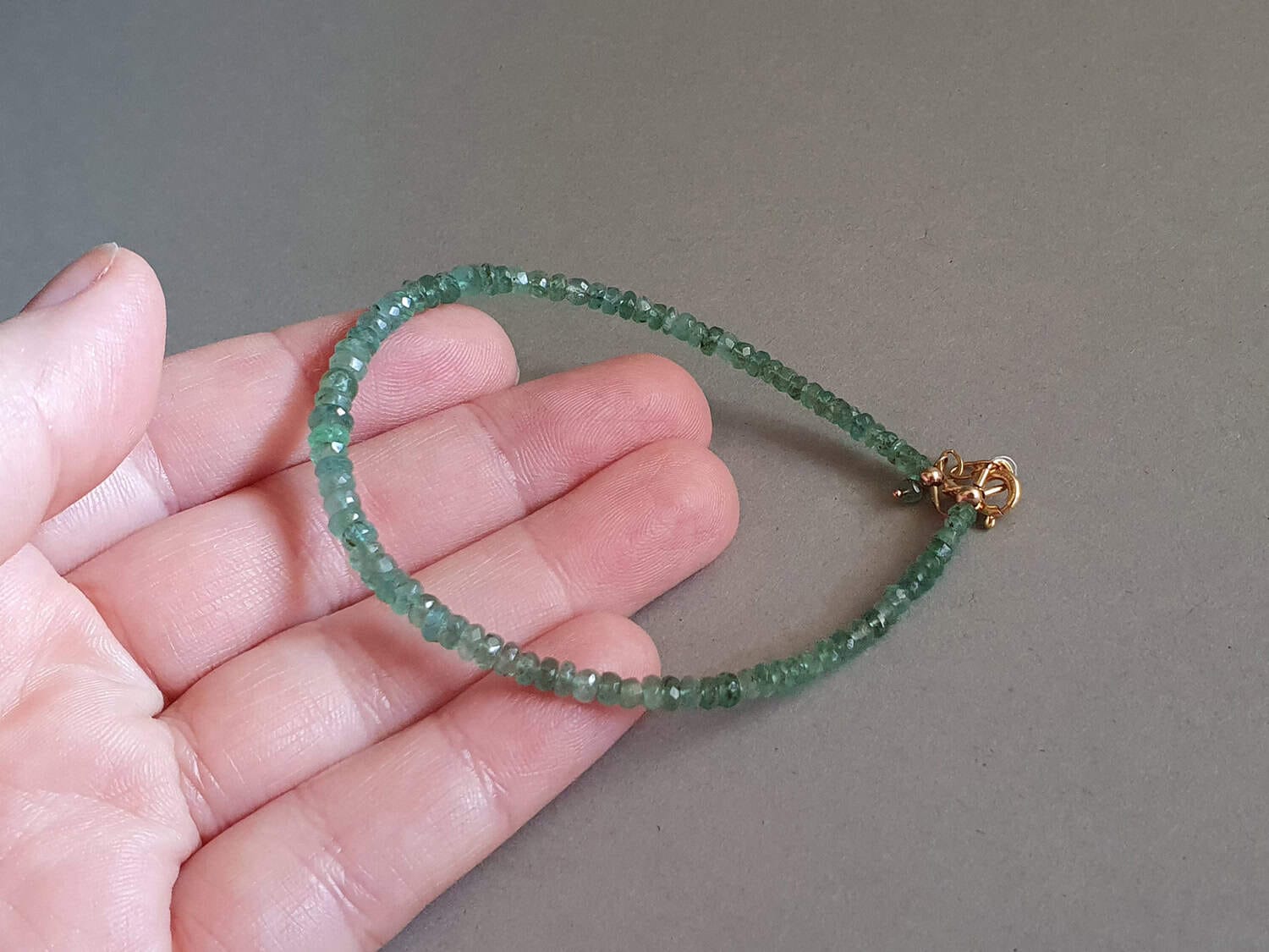Brățară realizată din aur filat și rondele fațetate de aproximativ 2,5-4,5 mm din smarald prețios, natural, netratat termic. Disponibilă și în varianta cu argint sau aur filat roz. Mai multe informații despre aurul filat (gold filled) găsiți aici.