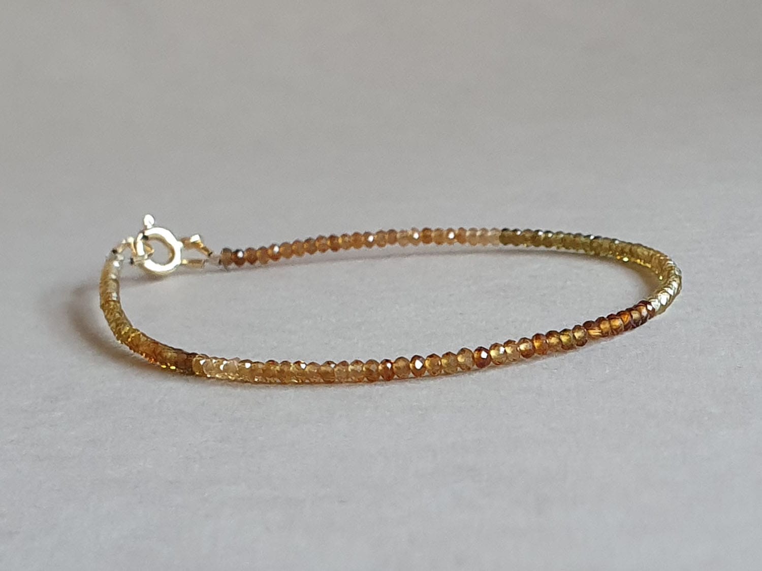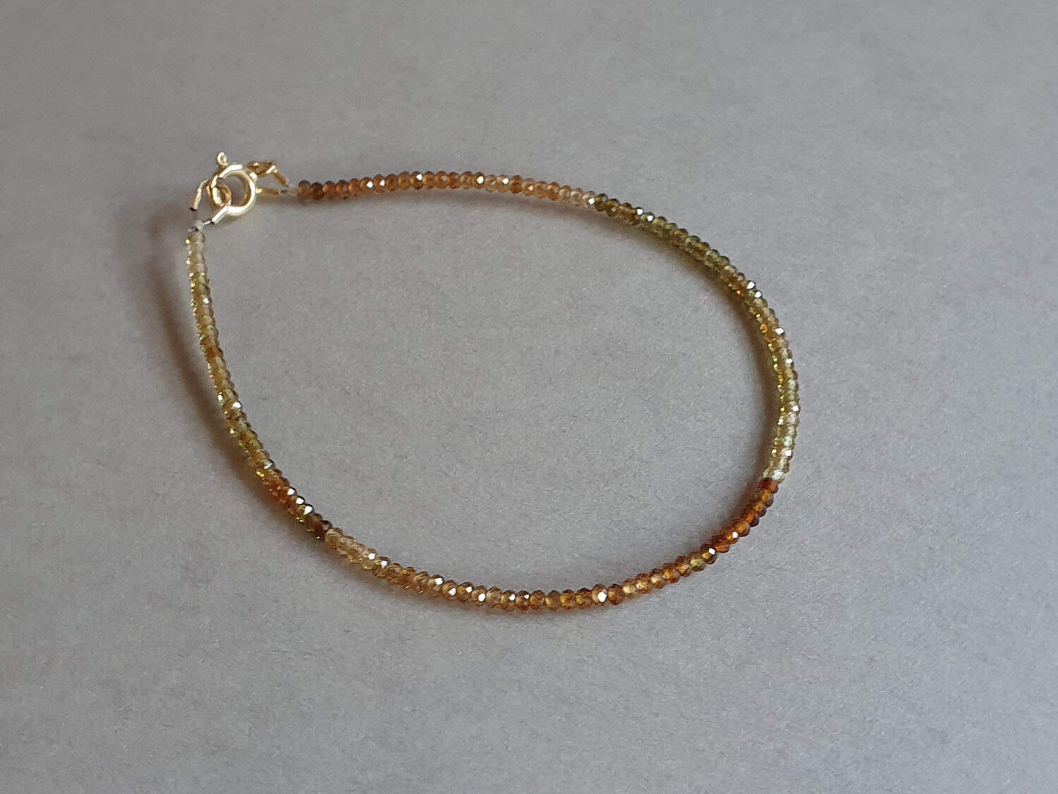 Brățară realizată cu elemente din aur filat galben și rondele fațetate de 1,8 mm din turmalină maroniu-verzui. Mai multe informații despre aurul filat (gold filled) găsiți aici. Disponibilă și în varianta cu aur filat roz sau argint.