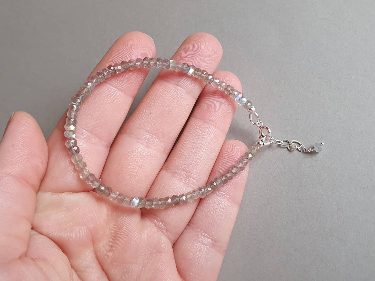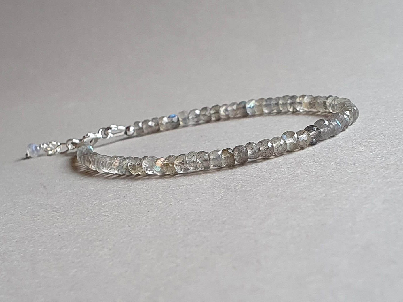 Brățară realizată din argint și rondele fațetate de 3 mm din labradorit natural, netratat termic. Disponibilă și în varianta cu aur filat (galben sau roz). Mai multe informații despre aurul filat (gold filled) găsiți aici.