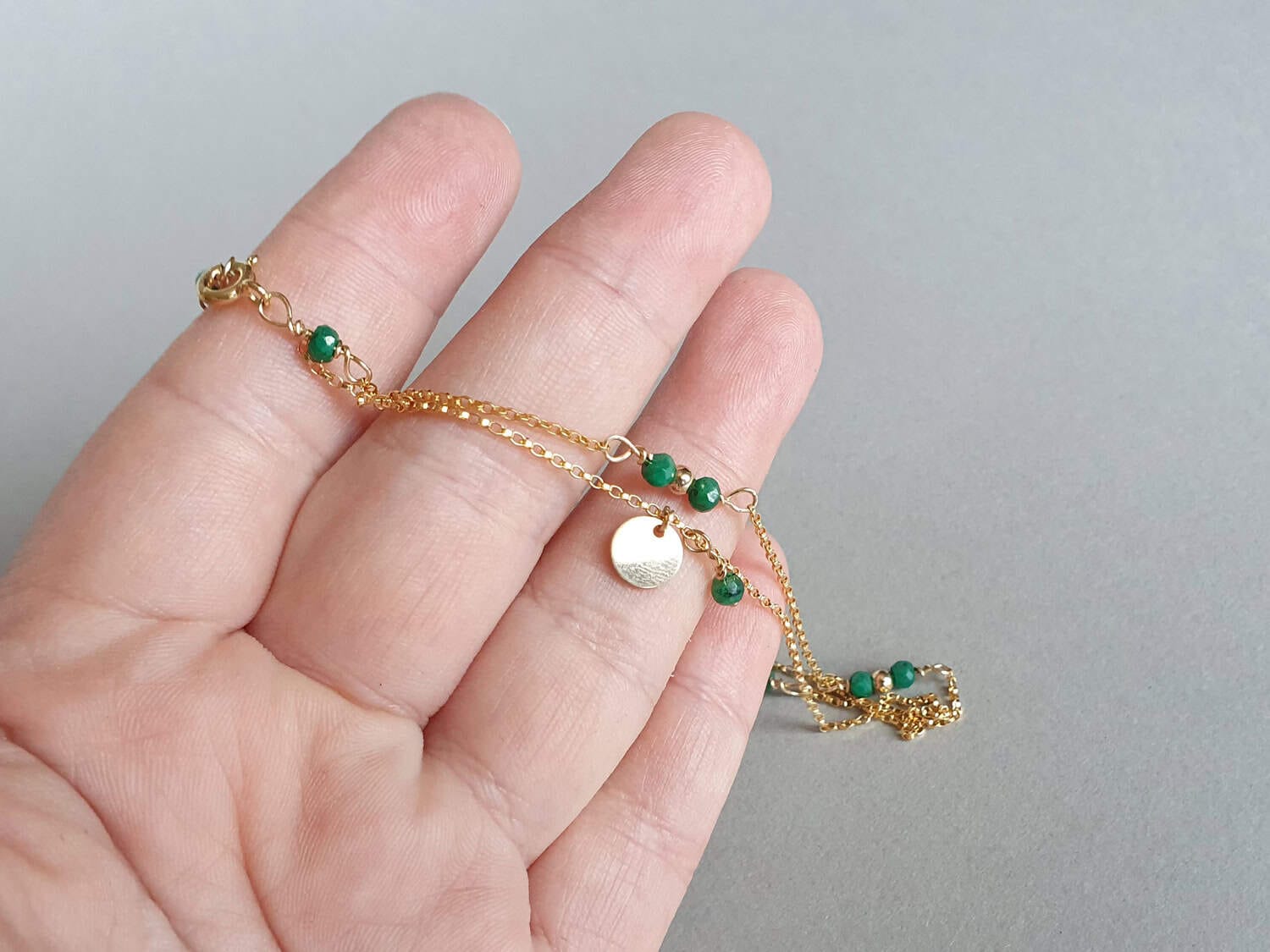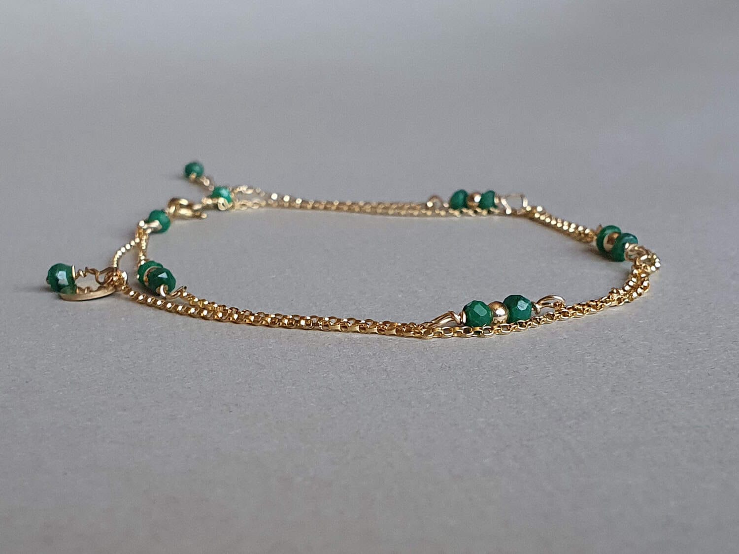 Brățară pentru gleznă, realizată din aur filat, un charm discret de 7 mm şi rondele fațetate de aproximativ 3,5-4 mm din smarald rădăcină natural, vopsit și tratat cu ulei pentru intensificarea culorii. Mai multe informații despre acest tip de smarald găsiți aici. Disponibilă și în varianta cu aur filat roz sau argint. Mai multe informații despre aurul filat (gold filled) găsiți aici.