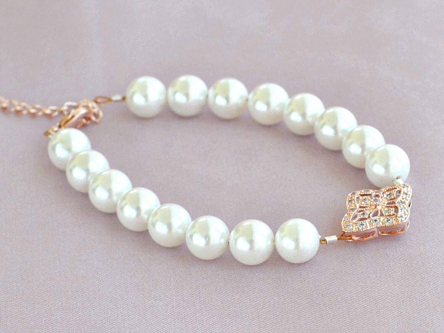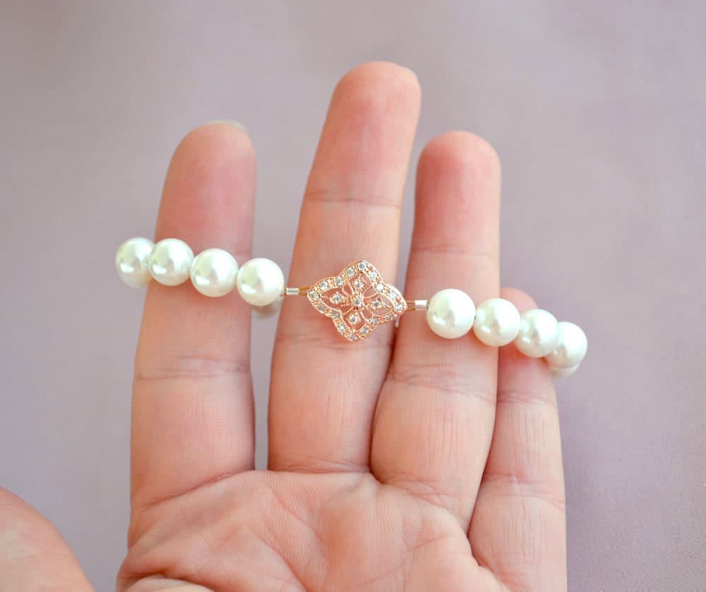 Brățară realizată din elemente din metal placat cu aur roz şi perle din sidef de 8 mm. Disponibilă și în varianta placată cu rodiu. Mai multe informații despre perle găsiți aici.