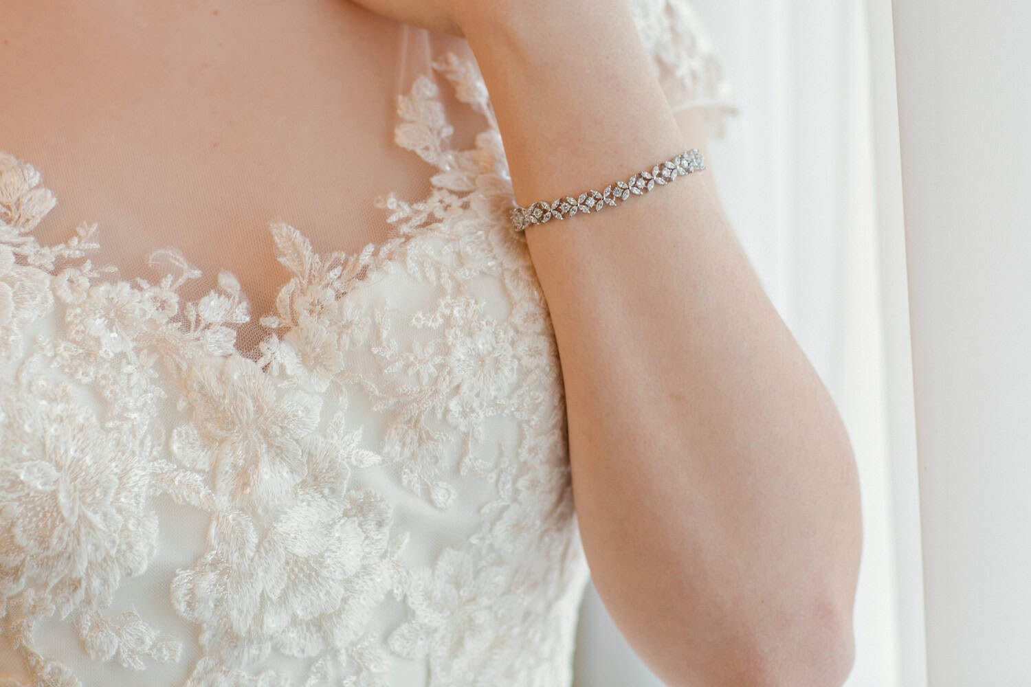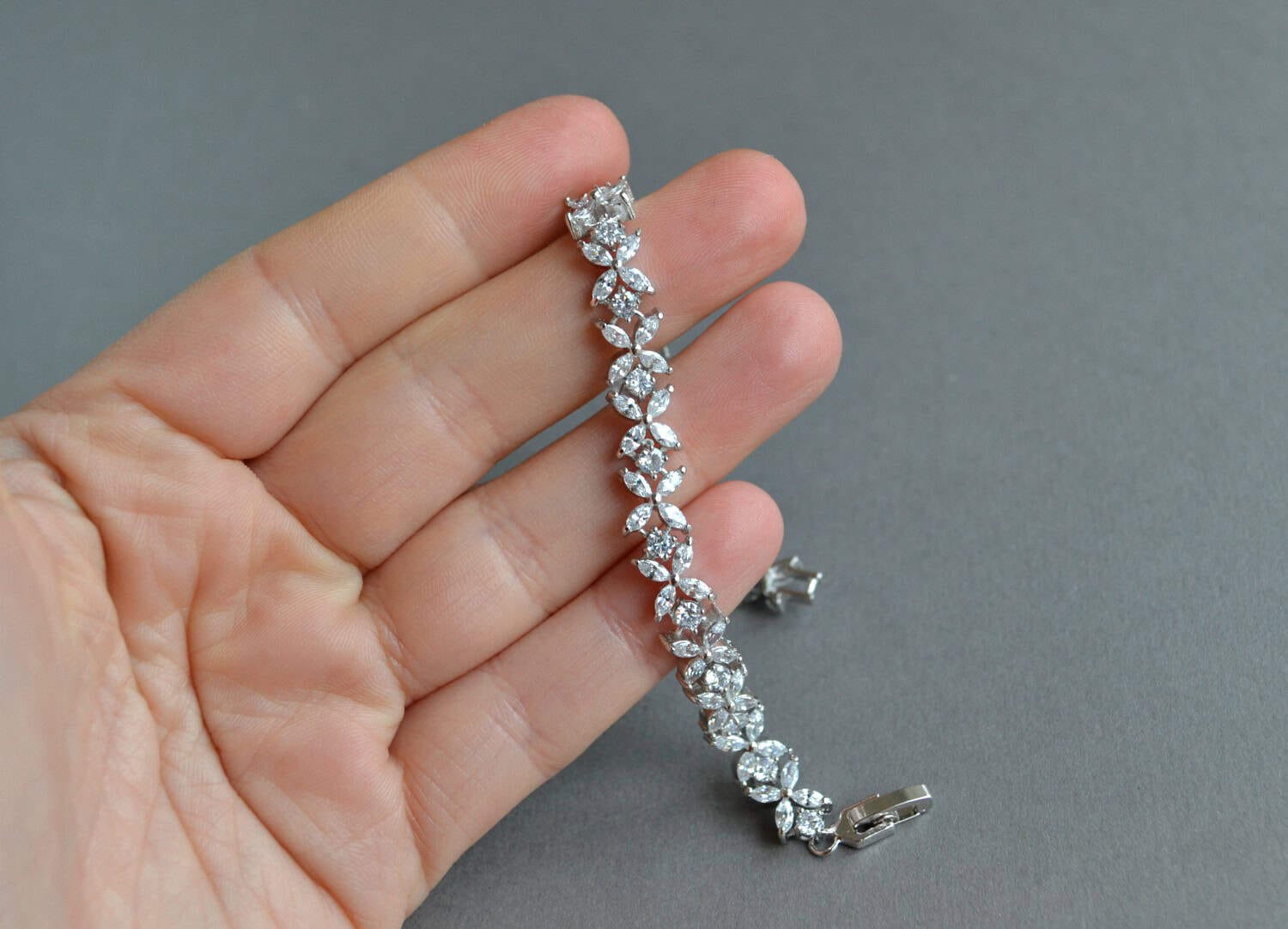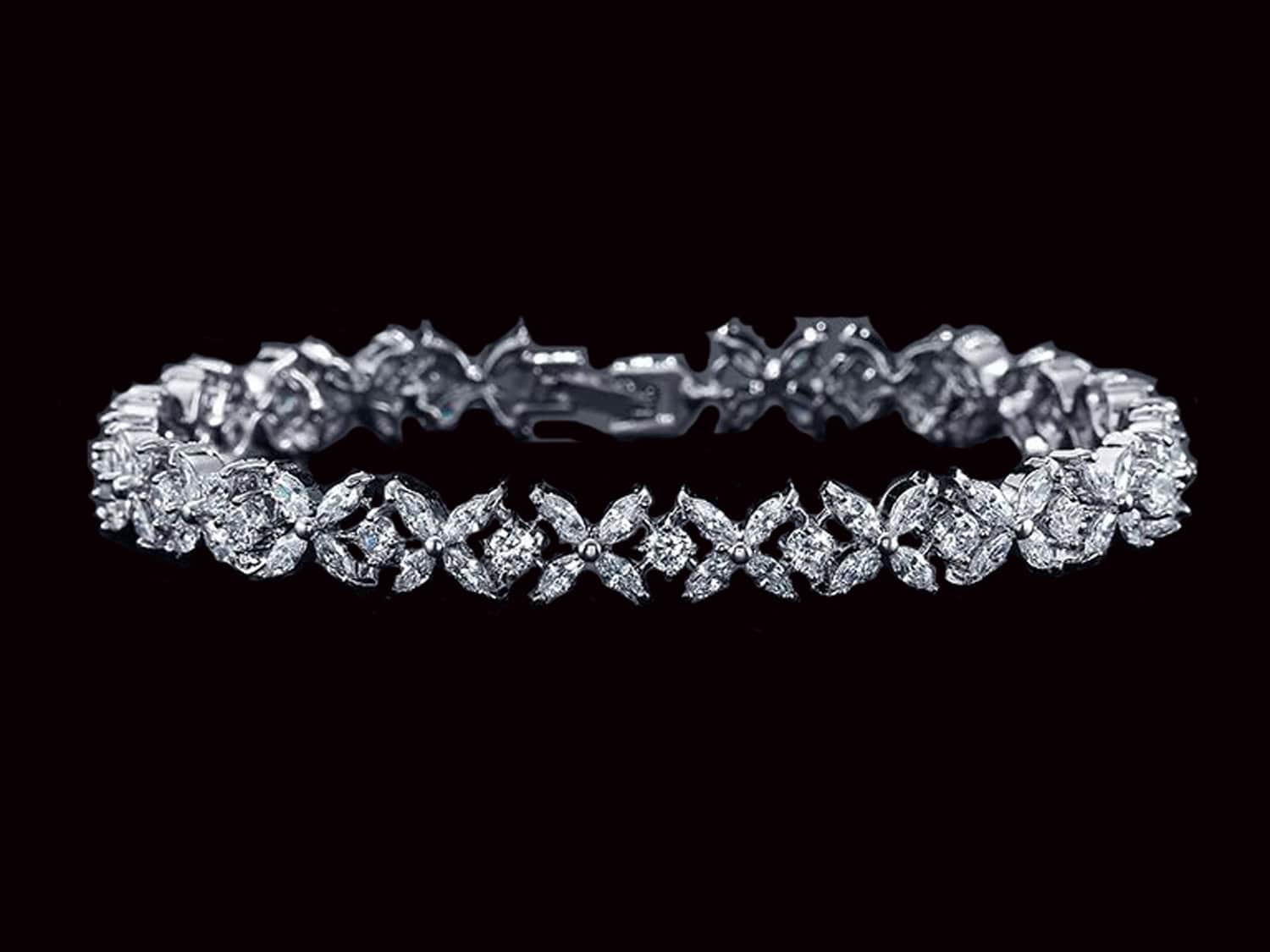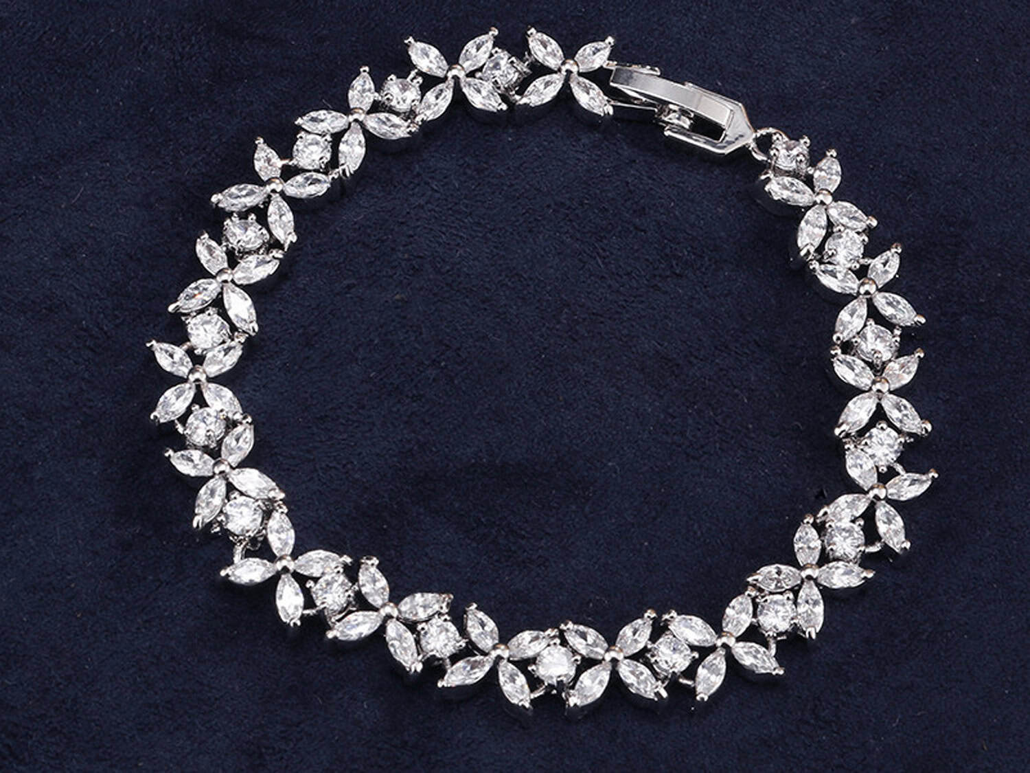 Brățară realizată cu cristale cubic zirconia, elemente placate cu rodiu. Dimensiuni: lățime 7 mm, lungimea este variabilă. La plasarea comenzii, vă rugăm să alegeți din meniu circumferința încheieturii mâinii, măsurată strâns, conform instrucțiunilor de aici.
