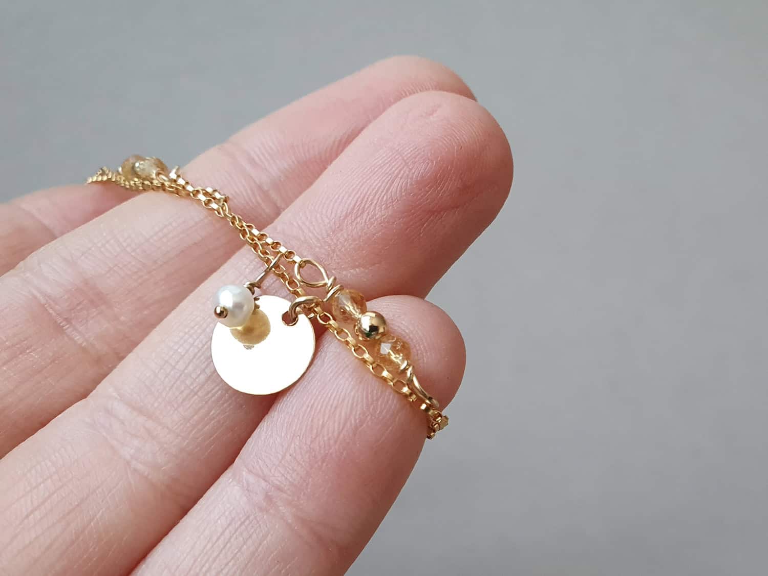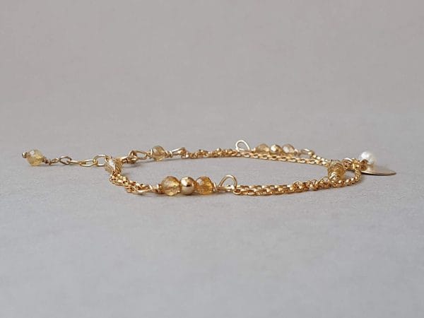 Brățară în stil minimalist realizată din aur filat galben, rondele fațetate de 2,5-2,7 mm din citrin natural, netratat termic și o mică perlă de cultură. Disponibilă și în varianta cu argint sau aur filat roz. Mai multe informații legate de aurul filat (gold filled), aici.