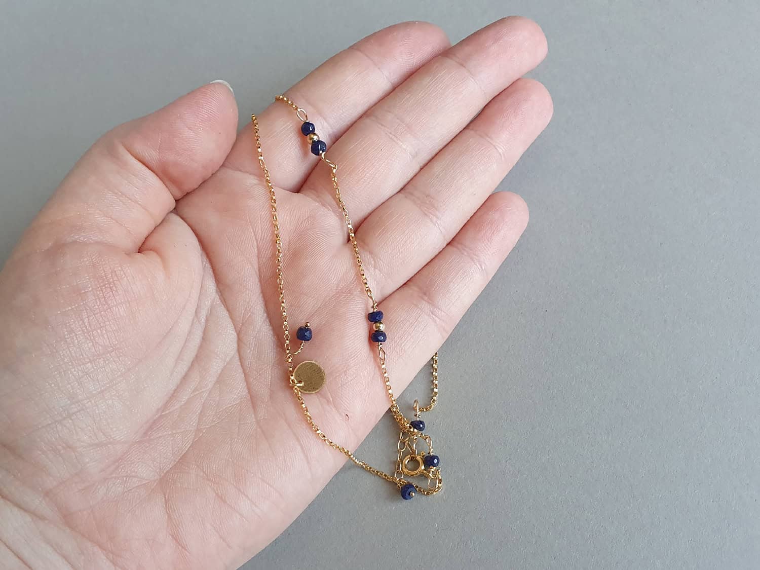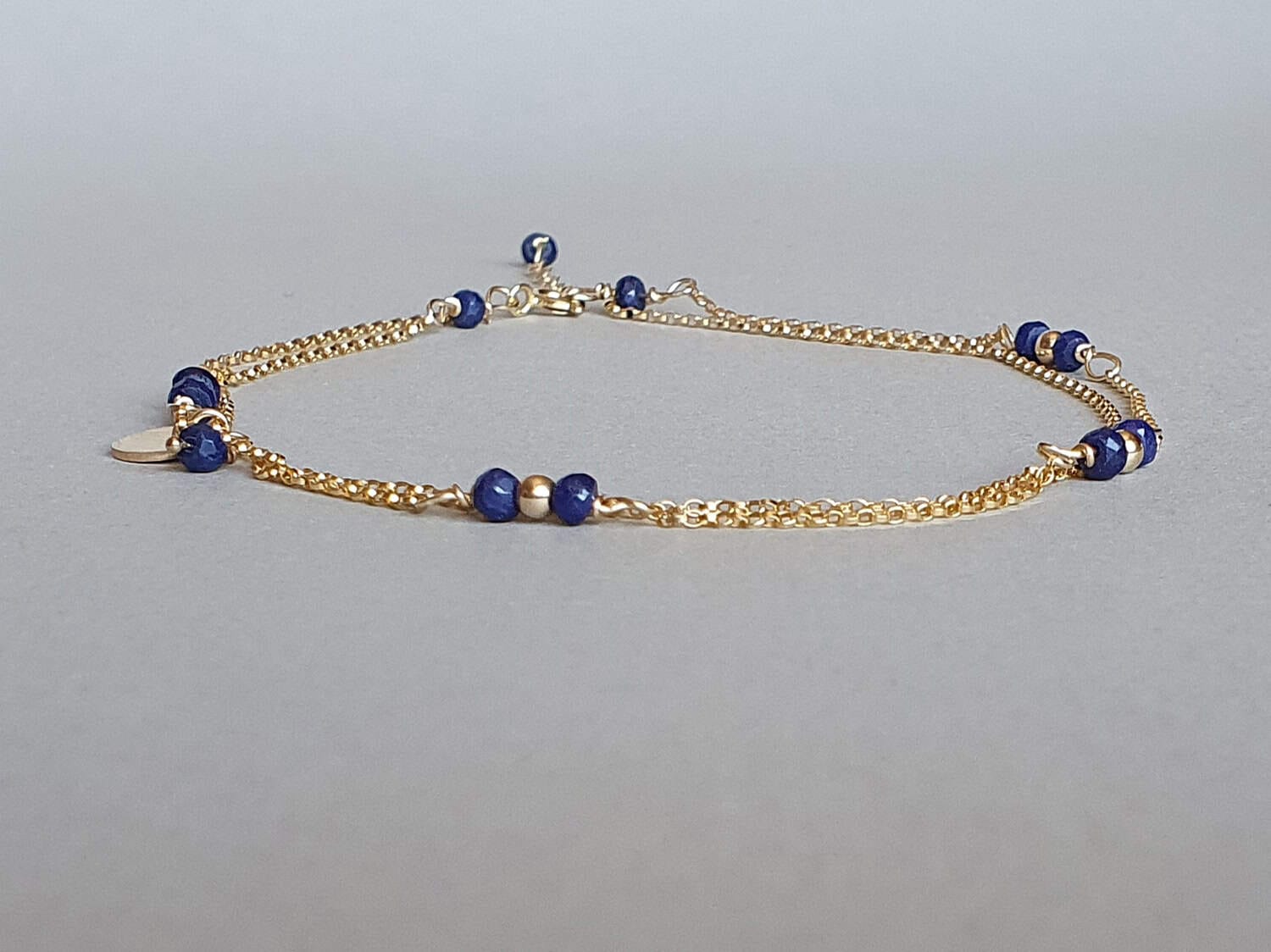 Brățară în stil minimalist realizată din aur filat, un charm discret de 7 mm şi rondele fațetate de aproximativ 3-3,5 mm din safir rădăcină natural, vopsit și tratat cu ulei pentru intensificarea culorii. Mai multe informații despre acest tip de safir găsiți aici. Disponibilă și în varianta cu argint sau aur filat roz. Mai multe informații despre aurul filat (gold filled) găsiți aici.