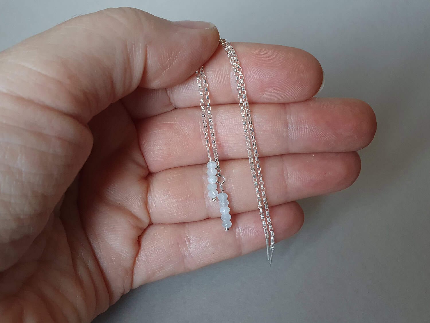 Cercei cu argint și aquamarin, tip threader. Lungime cercei: aproximativ 13 cm. Disponibili și în varianta cu aur filat.