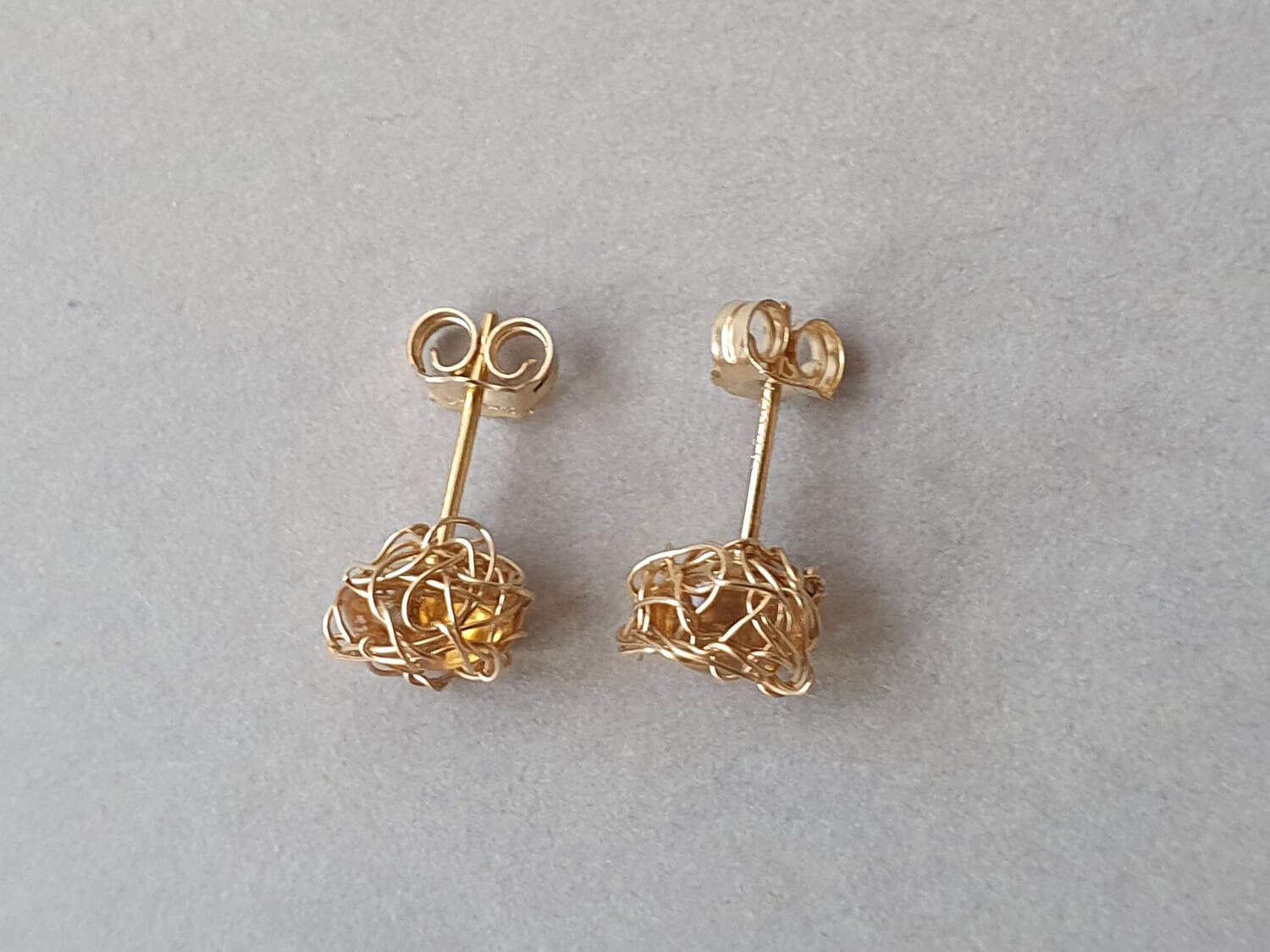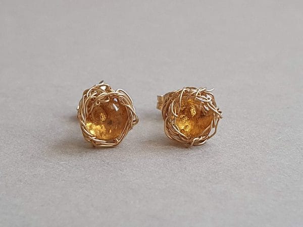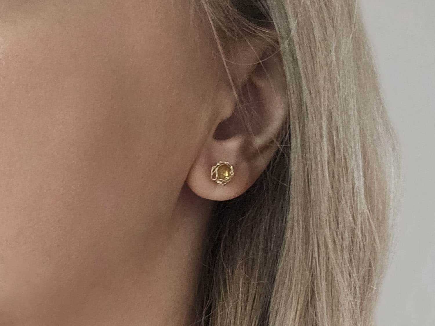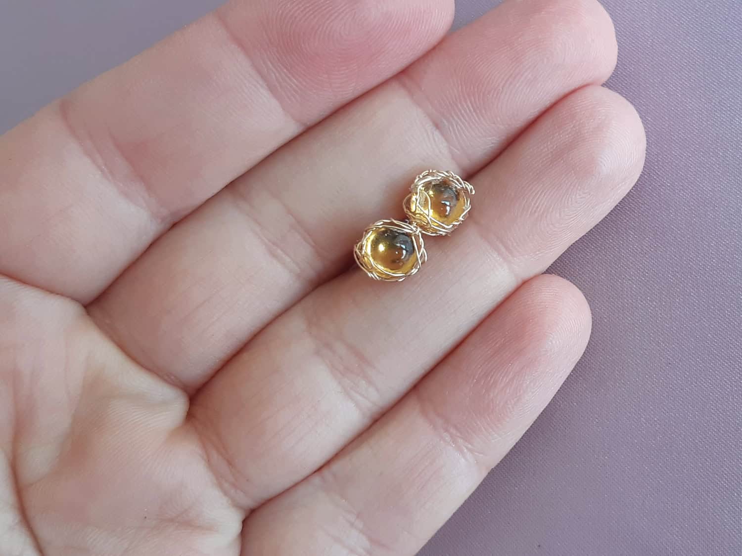Cercei realizați din aur filat și citrin de 6 mm, natural, netratat termic. Mai multe informații despre aurul filat găsiți aici. Pot fi realizați și în varianta cu argint. Disponibili și ca set, cu pandantiv asortat, aici.