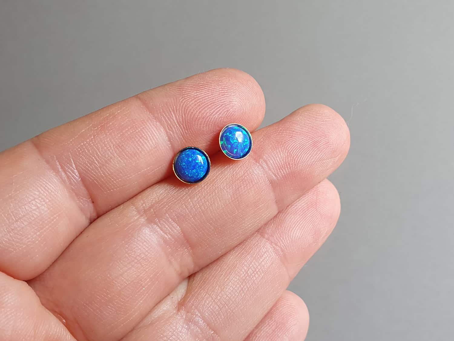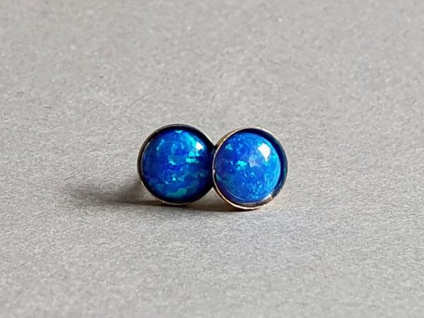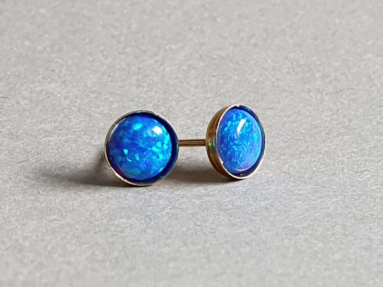 Cercei realizați din aur filat și opal de sinteză albastru închis de 6 mm. Mai multe informații despre aurul filat găsiți aici. Disponibili și în varianta cu argint.