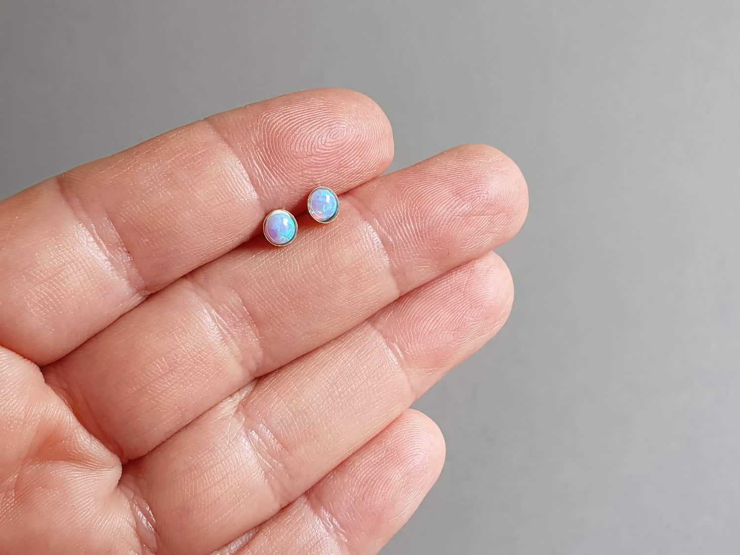 Cercei realizați din aur filat și opal de sinteză albastru de 4 mm. Mai multe informații despre aurul filat găsiți aici. Disponibili și în varianta cu argint.