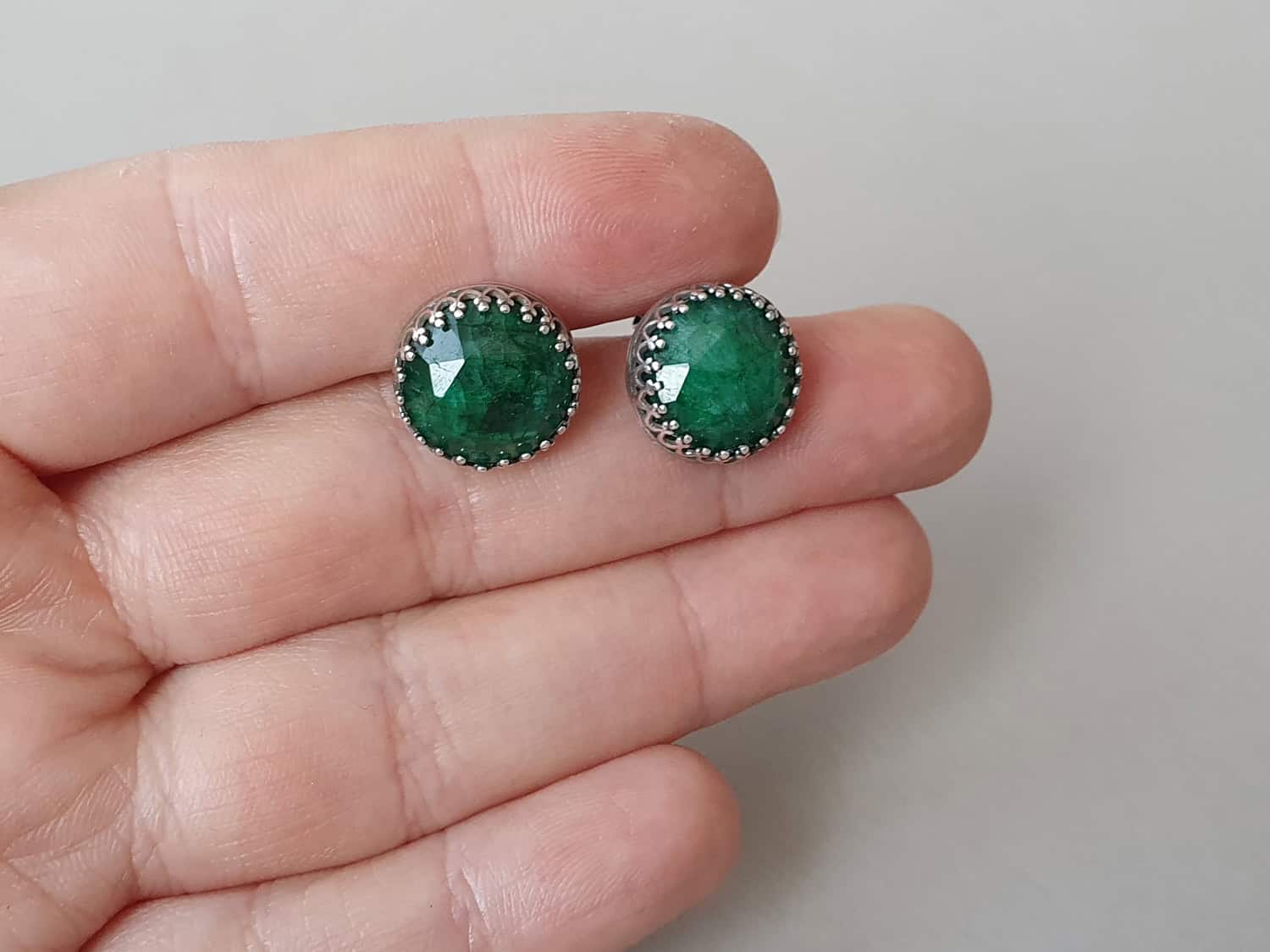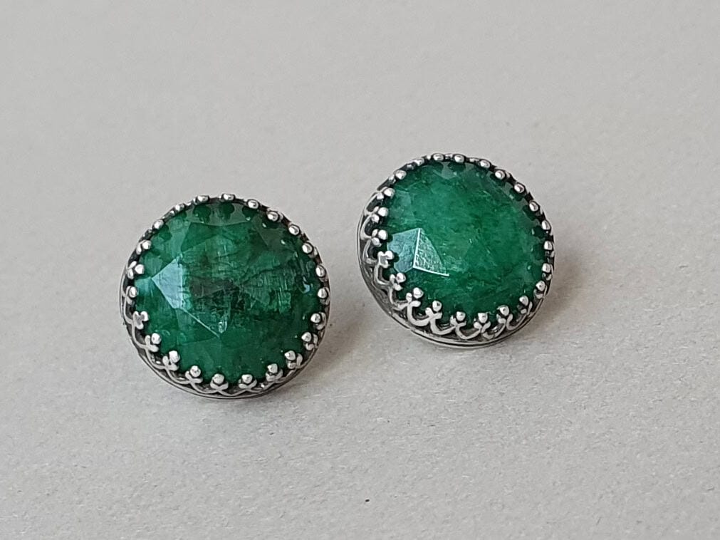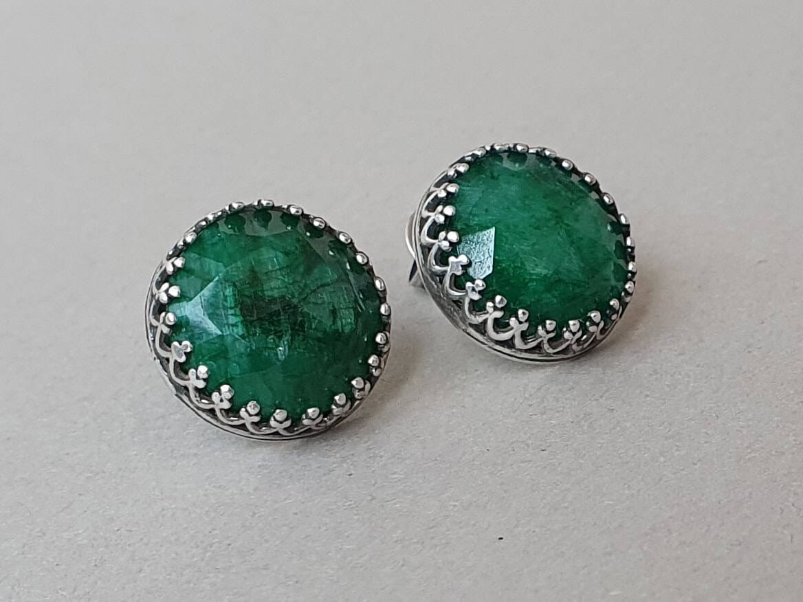 Cercei cu șurub, realizați din argint și smarald rădăcină de 12 mm, natural, vopsit și tratat pentru intensificarea culorii. Mai multe informații despre acest tip de smarald găsiți aici. Imaginile sunt cu titlu informativ, produsul livrat putând fi ușor diferit.