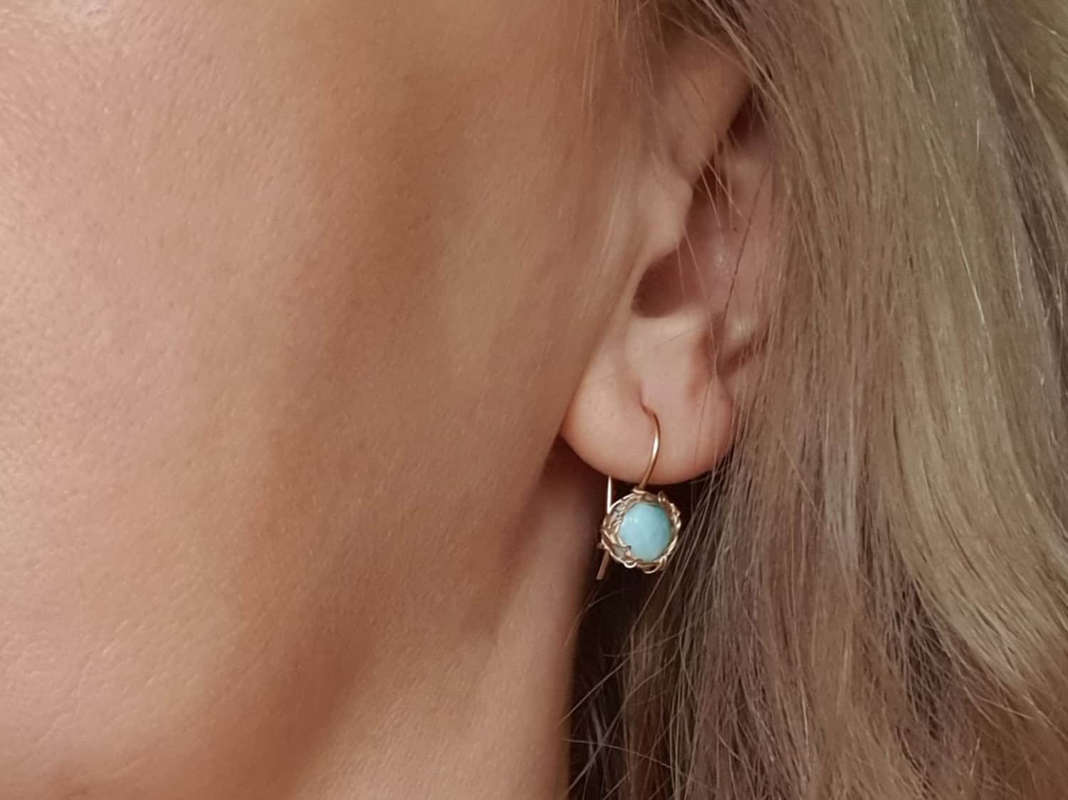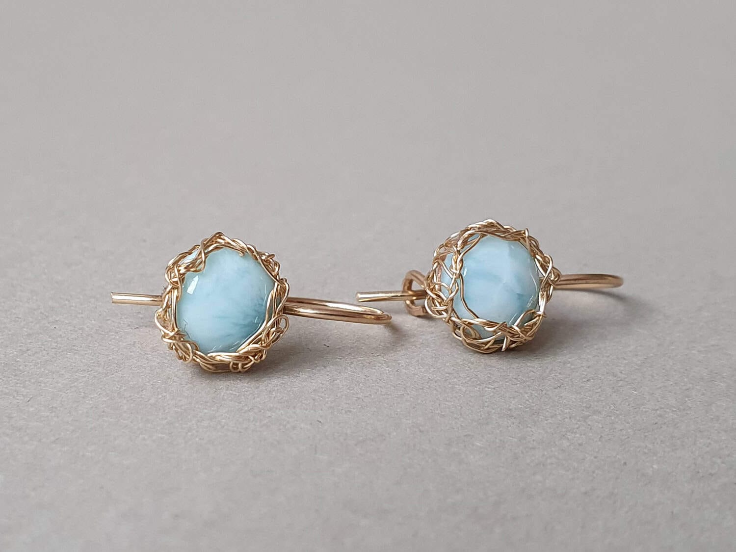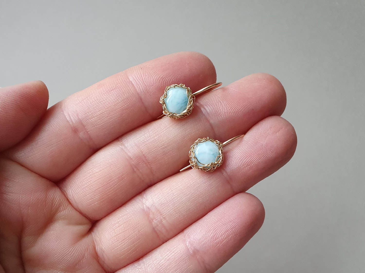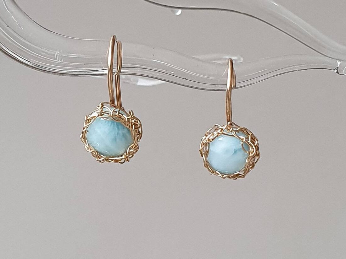 Cercei cu tijă, realizați din aur filat și larimar de 8 mm, natural, netratat termic. Lungime aproximativ 17 mm (1,7 cm). Mai multe informații despre aurul filat găsiți aici. Pot fi realizați și în varianta cu argint.