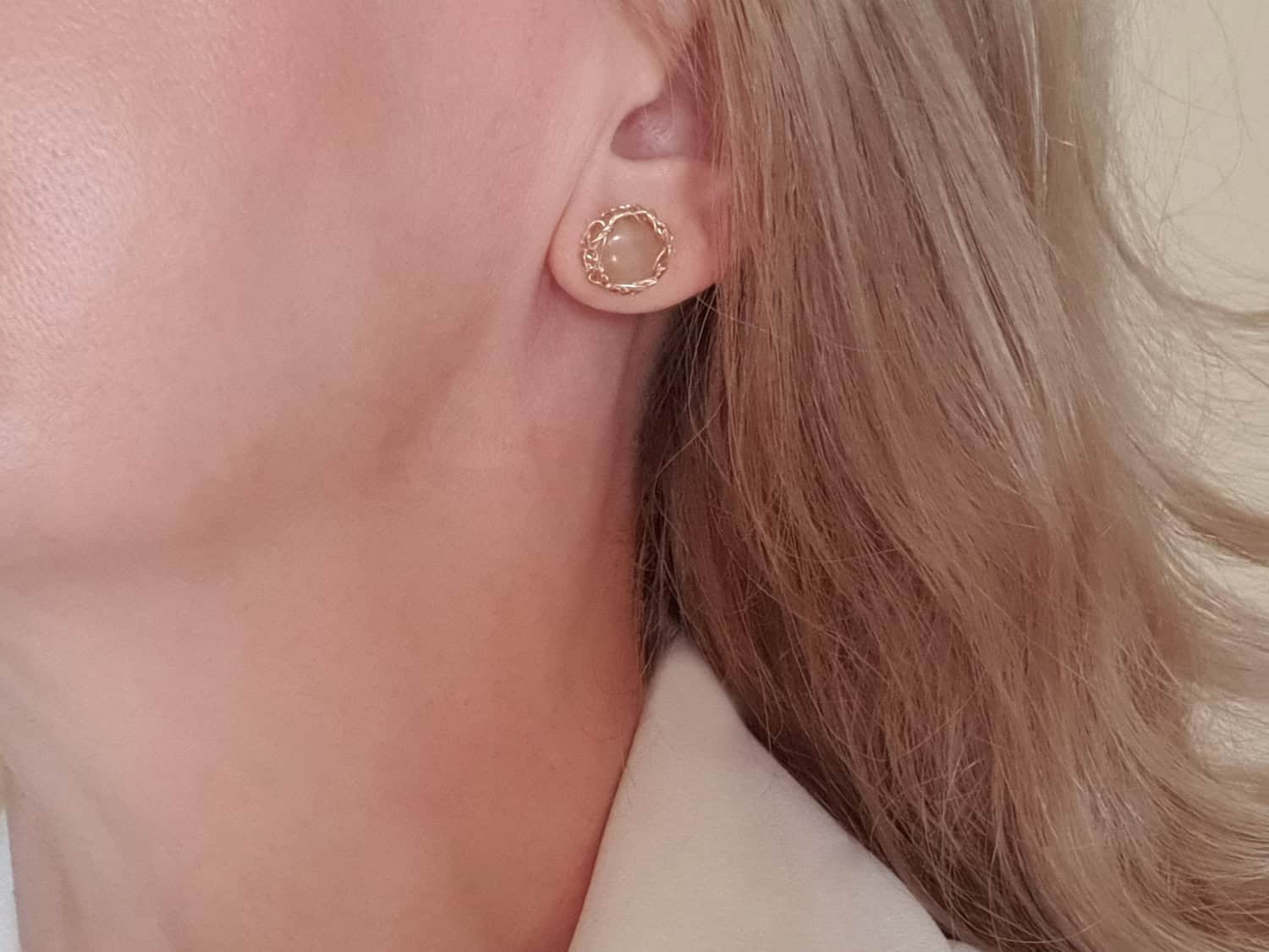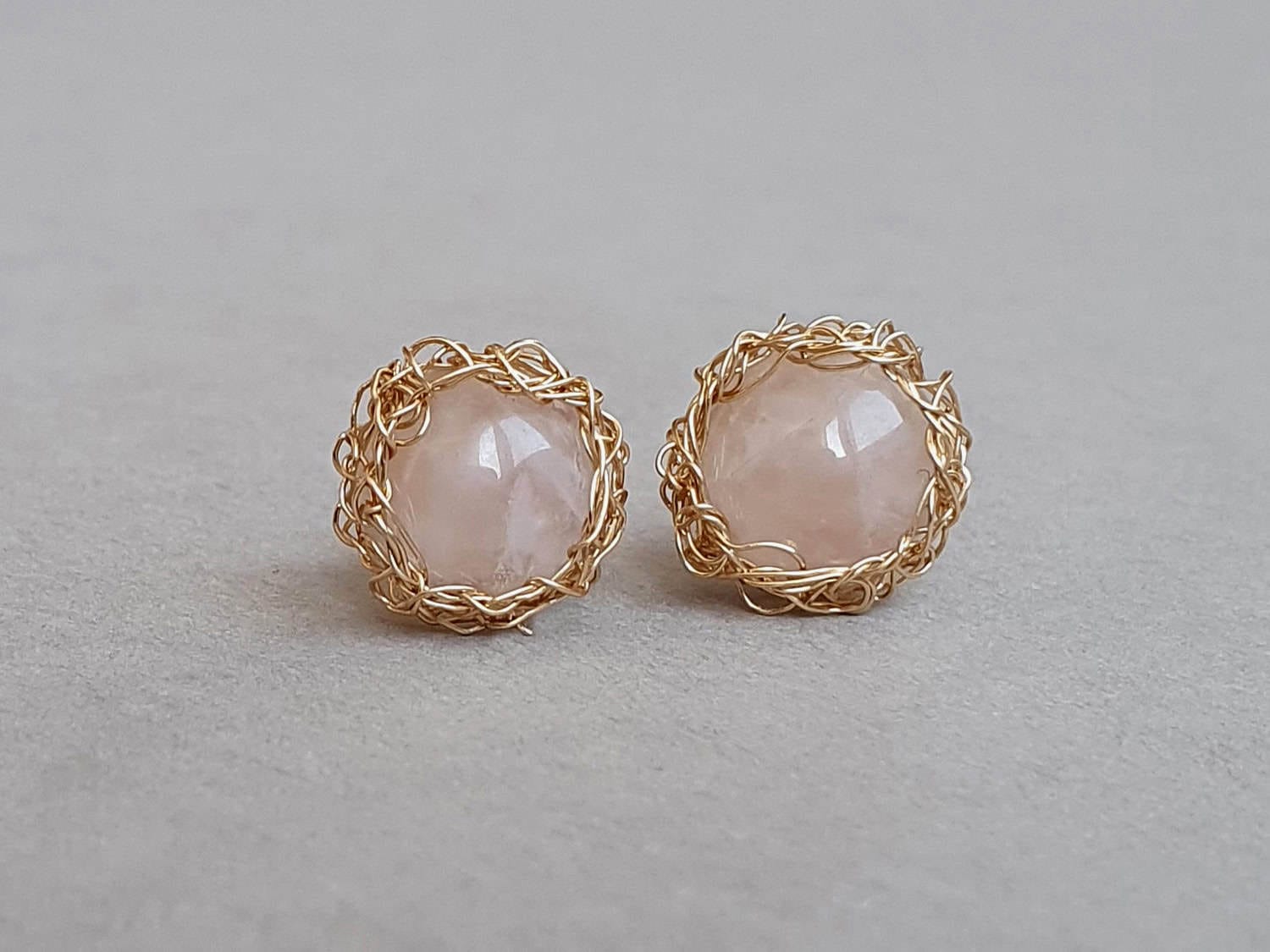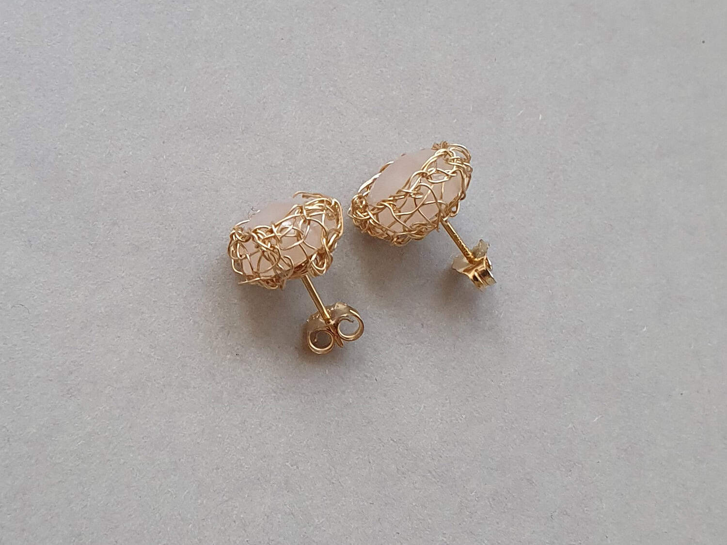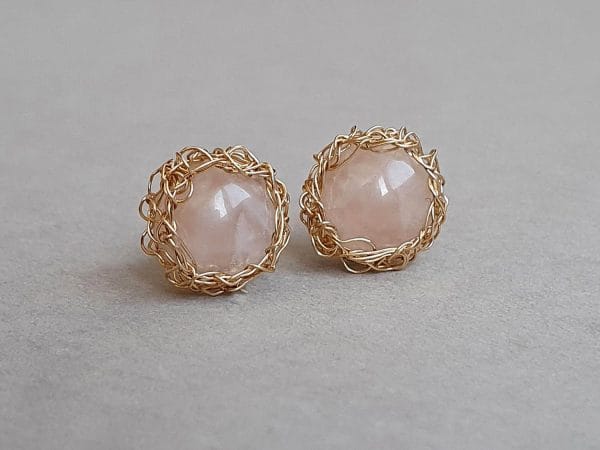 Cercei realizați din aur filat şi cuarț roz natural, netratat termic. Cerceii se pot realiza și din argint. Mai multe informaţii legate de aurul filat găsiţi aici. Dimensiune totală: aproximativ 12 mm. Închidere cu șurub.