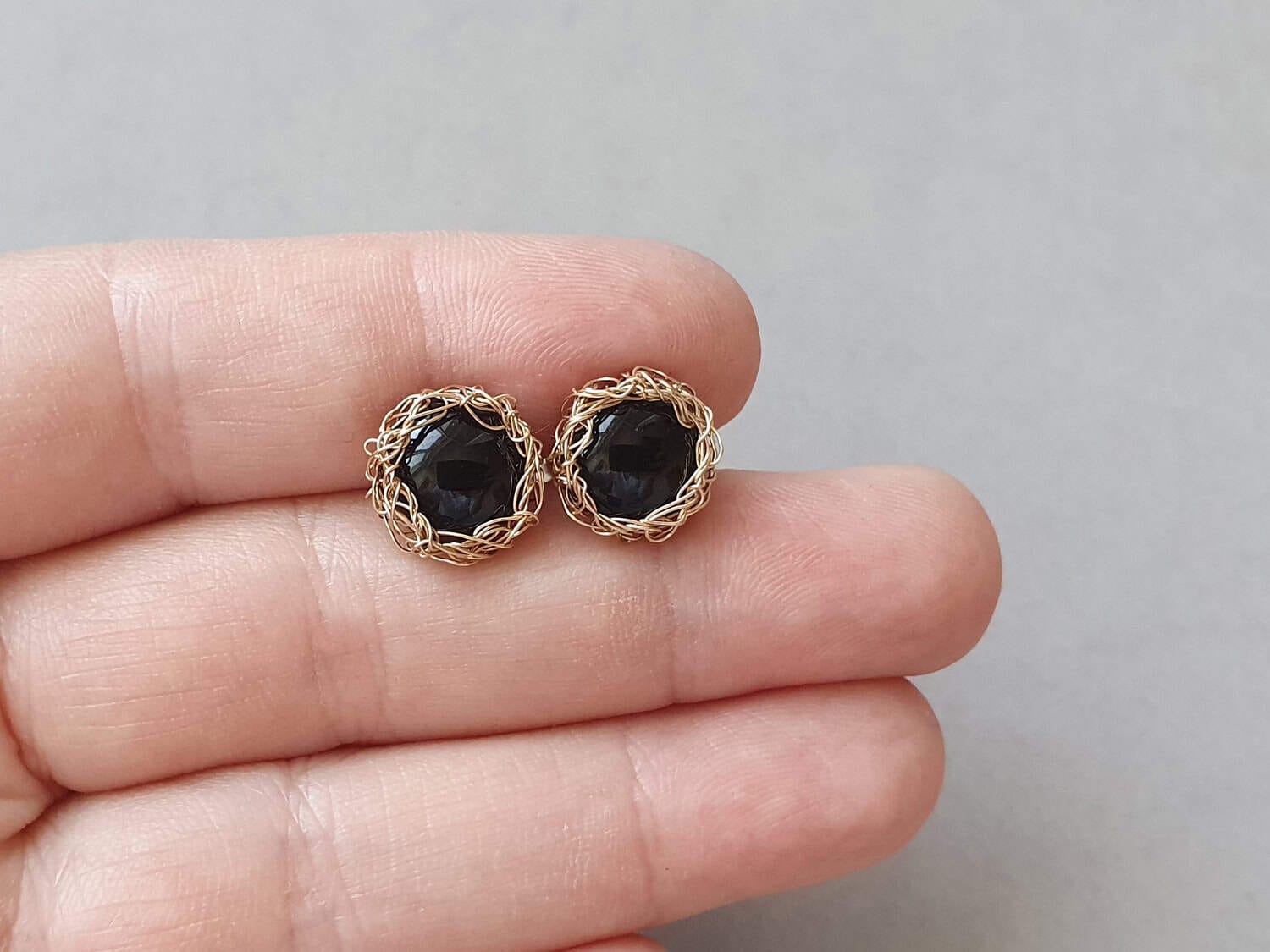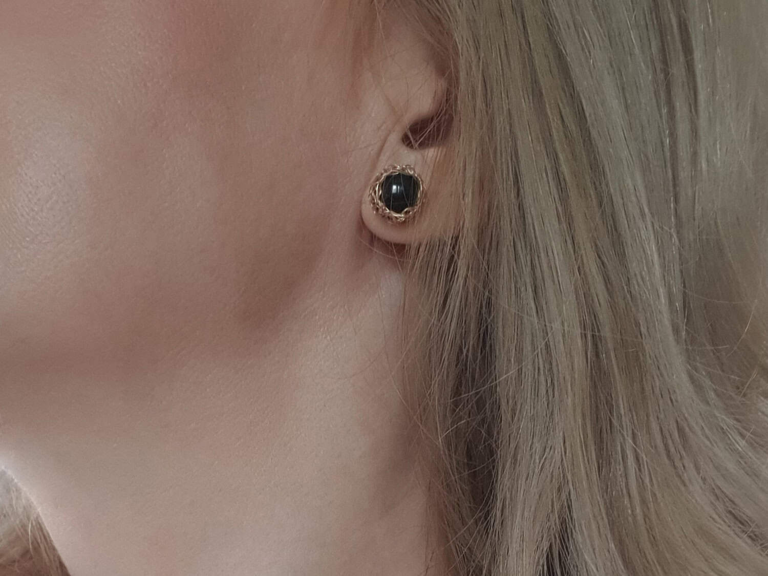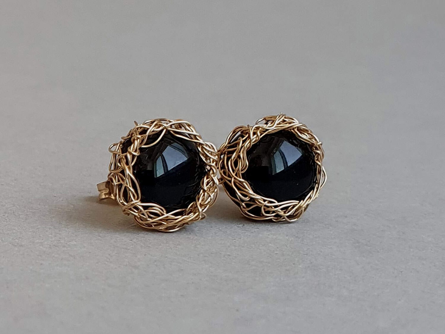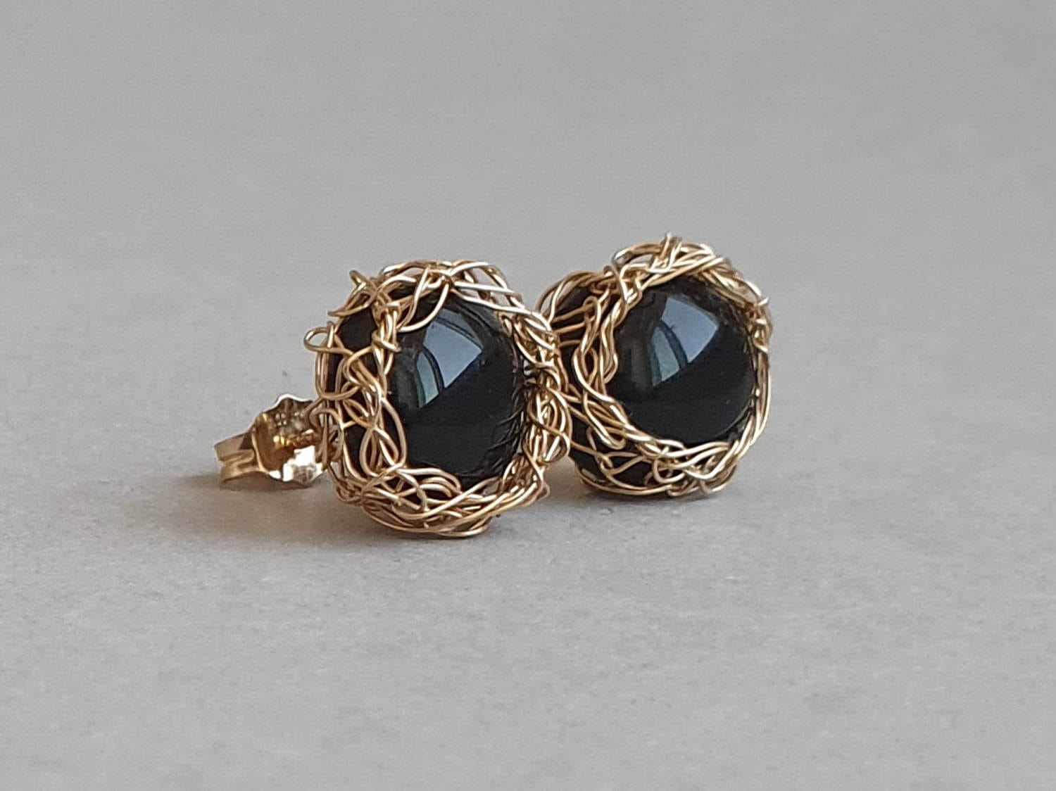 Cercei realizați din aur filat (gold filled) şi onix negru nefațetat natural, netratat termic. Mai multe informaţii legate de aurul filat găsiţi aici. Cerceii se pot realiza și din argint sau aur filat roz. Diametru: aproximativ 12 mm.