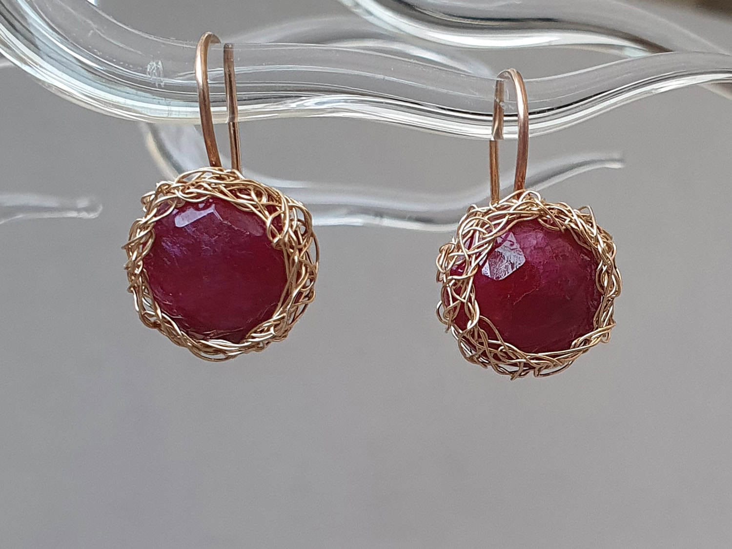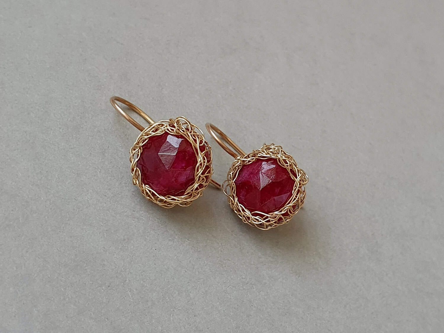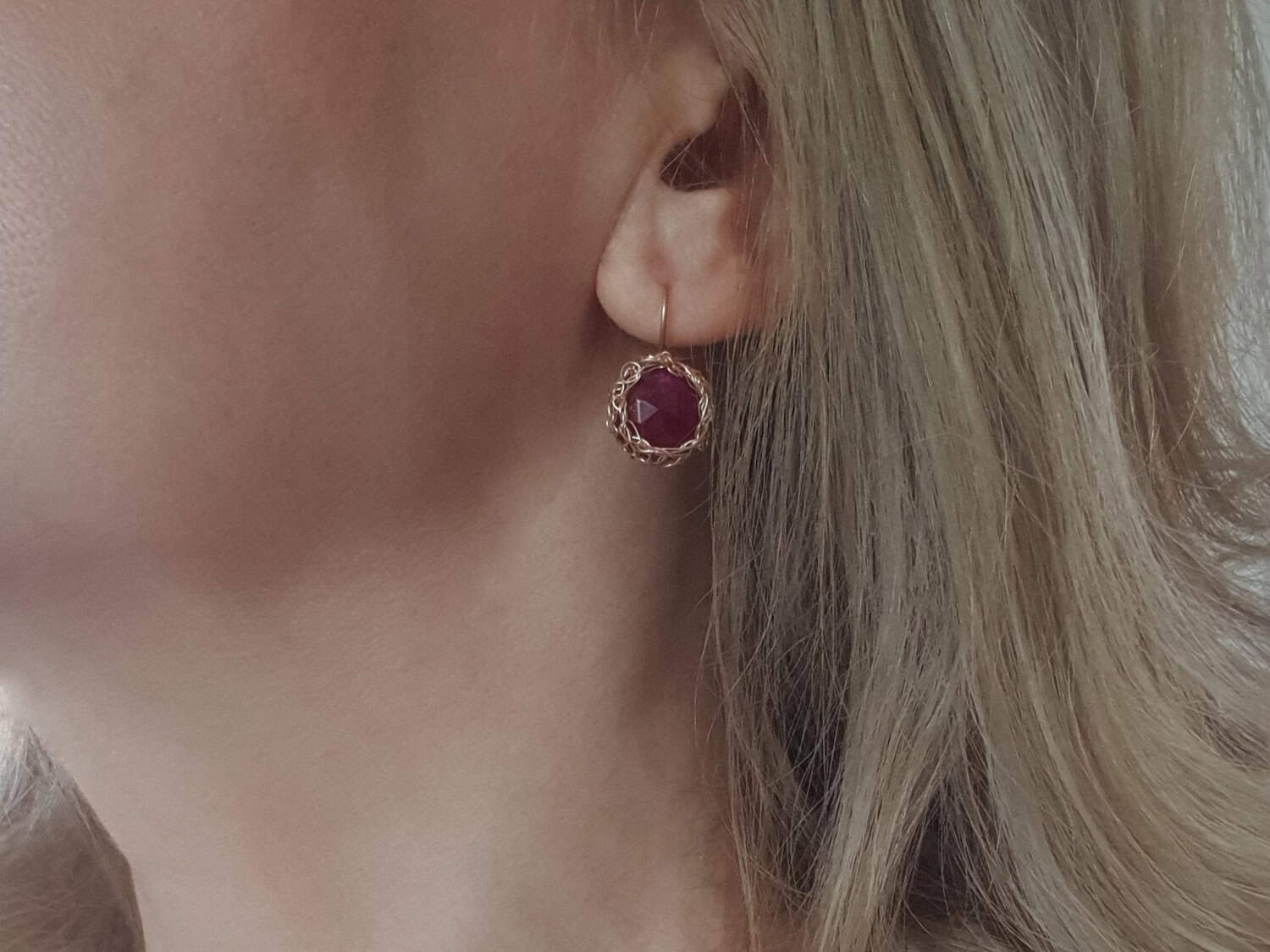 Cercei realizați din aur filat și rubin rădăcină de 12 mm, natural, vopsit și tratat pentru intensificarea culorii.Mai multe informații despre acest tip de rubin găsiți aici. Lungime cercei: aproximativ 25 mm. Disponibili și în varianta cu argint. Mai multe informații despre aurul filat (gold filled) găsiți aici.