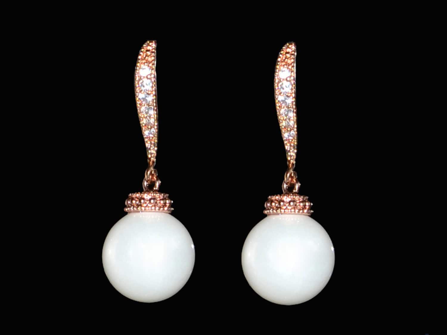 Cercei placați cu aur roz, cristale cubic zirconia și perlă din sidef de culoare ivoire. Perla are diametrul de 10 mm. Lungime totală: aproximativ 3 cm.