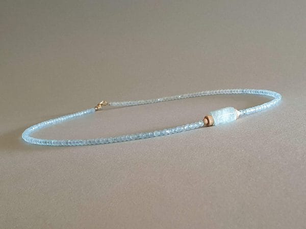 Colier confecționat din elemente din aur filat, un element și rondele fațetate de aproximativ 3 mm din aquamarin natural, netratat termic. Colierul este disponibil în trei lungimi (la fiecare se adaugă un lănțișor prelungitor). Disponibil și în varianta cu elemente din aur filat roz. Mai multe detalii despre aurul filat găsiți aici.