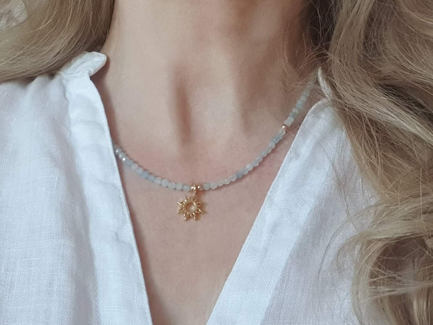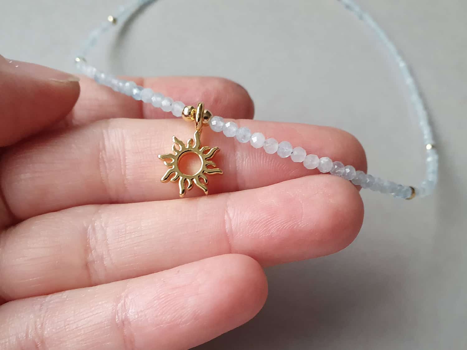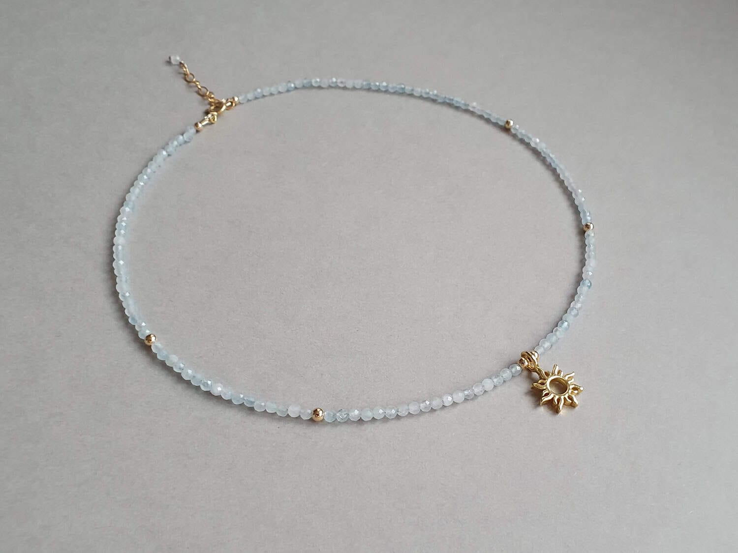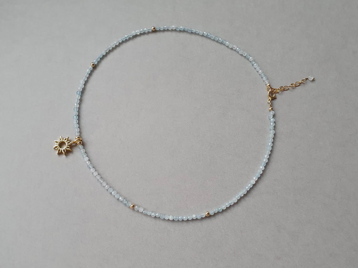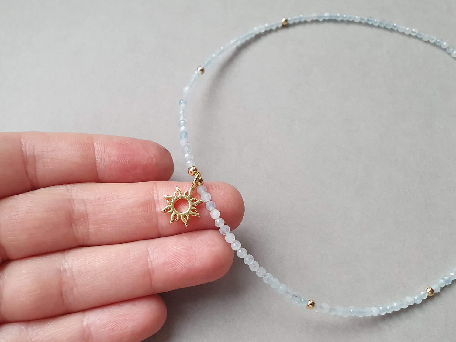 Colier confecționat din elemente din aur filat și rondele fațetate de aproximativ 3 mm din aquamarin natural, netratat termic. Colierul este disponibil în trei lungimi (la fiecare se adaugă un lănțișor prelungitor). Mai multe detalii despre aurul filat găsiți aici.