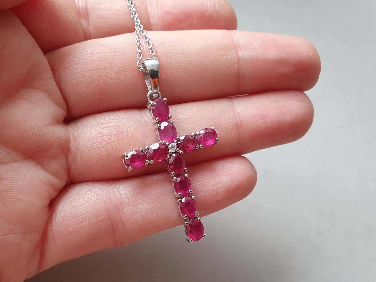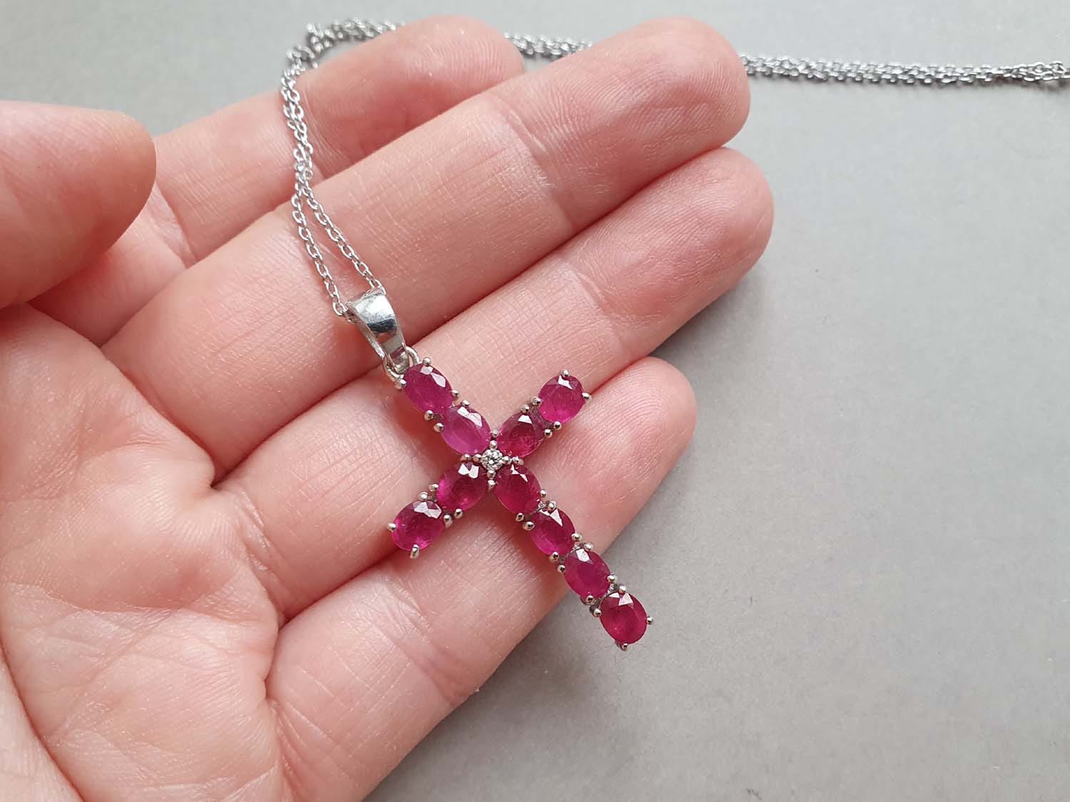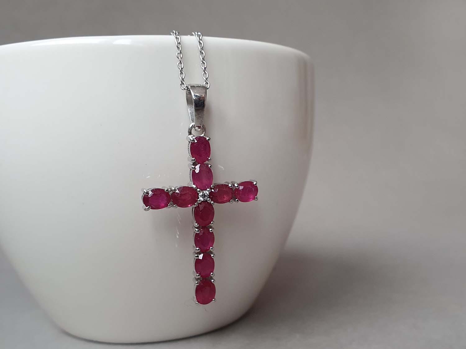 Colier confecționat folosind lanț, elemente din argint și o cruce din rubin rădăcină natural. Lungime colier 45 cm, crucea din rubin are dimensiuni de aproximativ 4 x 2 cm. Colierul este prevăzut cu lănțișor prelungitor.