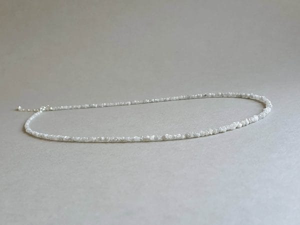 Colier confecționat din diamante brute de culoare albă de 2,7-2,9 mm și elemente din argint. Diamantele sunt naturale, netratate termic. Colierul este disponibil în trei lungimi – la plasarea comenzii vă rugăm să alegeți din meniu lungimea dorită. Prevăzut cu un lănțișor prelungitor. Disponibil și în varianta cu aur filat (galben sau roz). Mai multe informații despre aurul filat (gold filled) găsiți aici.