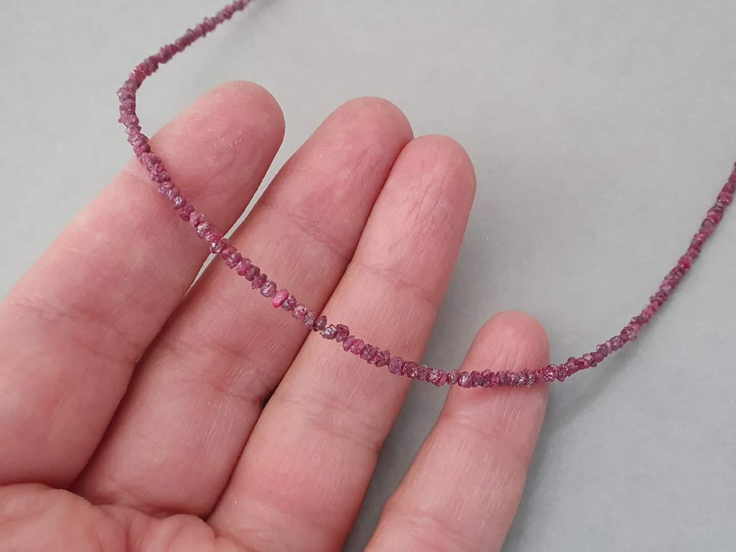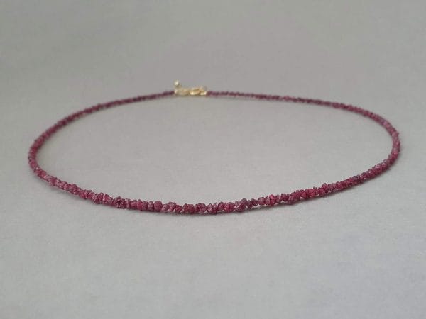 Colier confecționat din diamante brute de culoare roz de 2,5-2,7 mm și elemente din aur filat. Diamantele sunt naturale, netratate termic. Colierul este disponibil în trei lungimi – la plasarea comenzii vă rugăm să alegeți din meniu lungimea dorită. Prevăzut cu un lănțișor prelungitor. Disponibil și în varianta cu aur filat roz sau argint. Mai multe informații despre aurul filat (gold filled) găsiți aici.