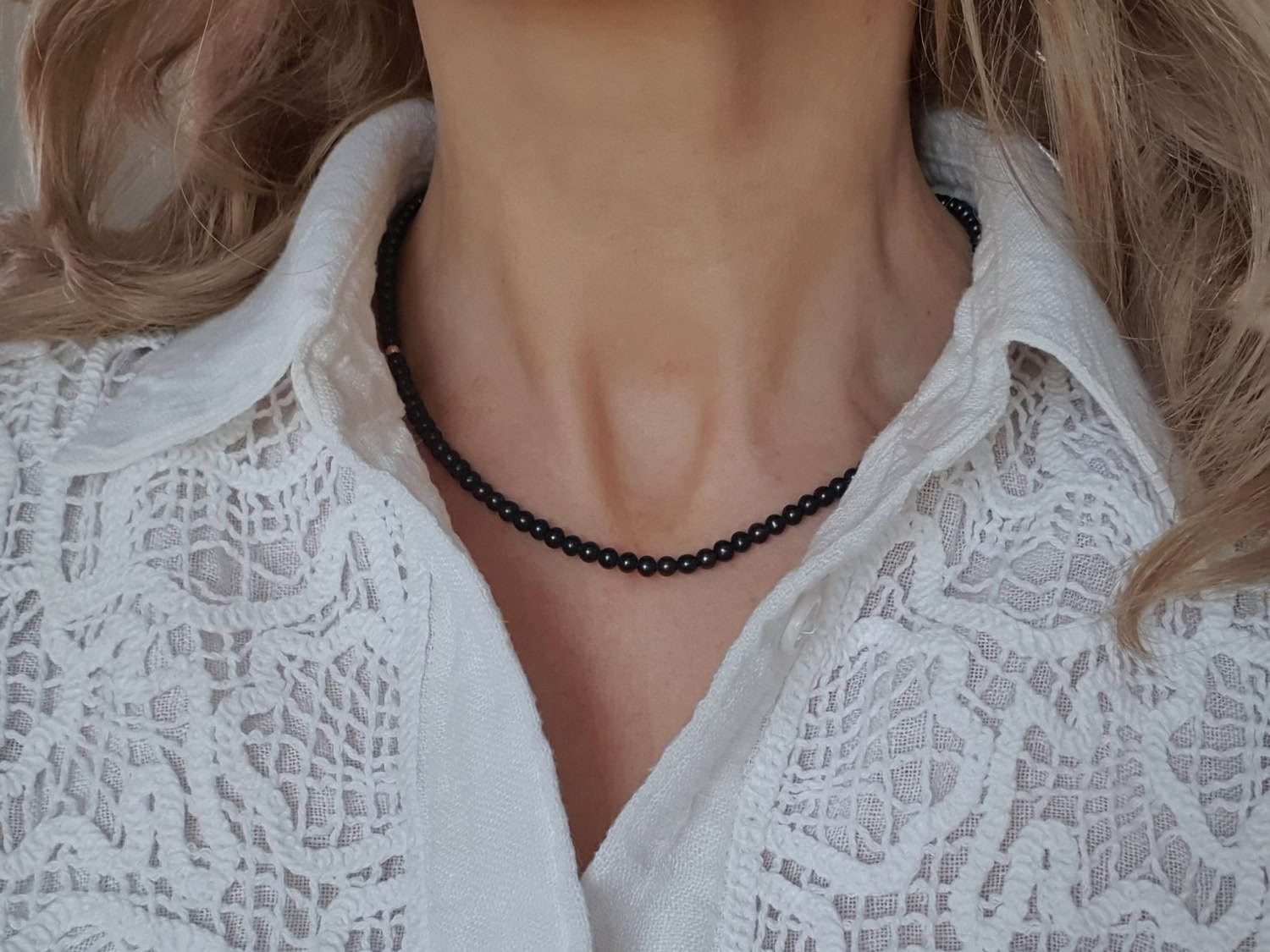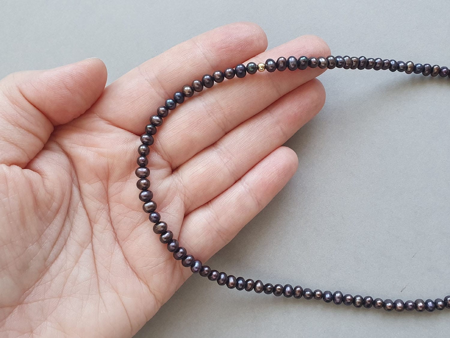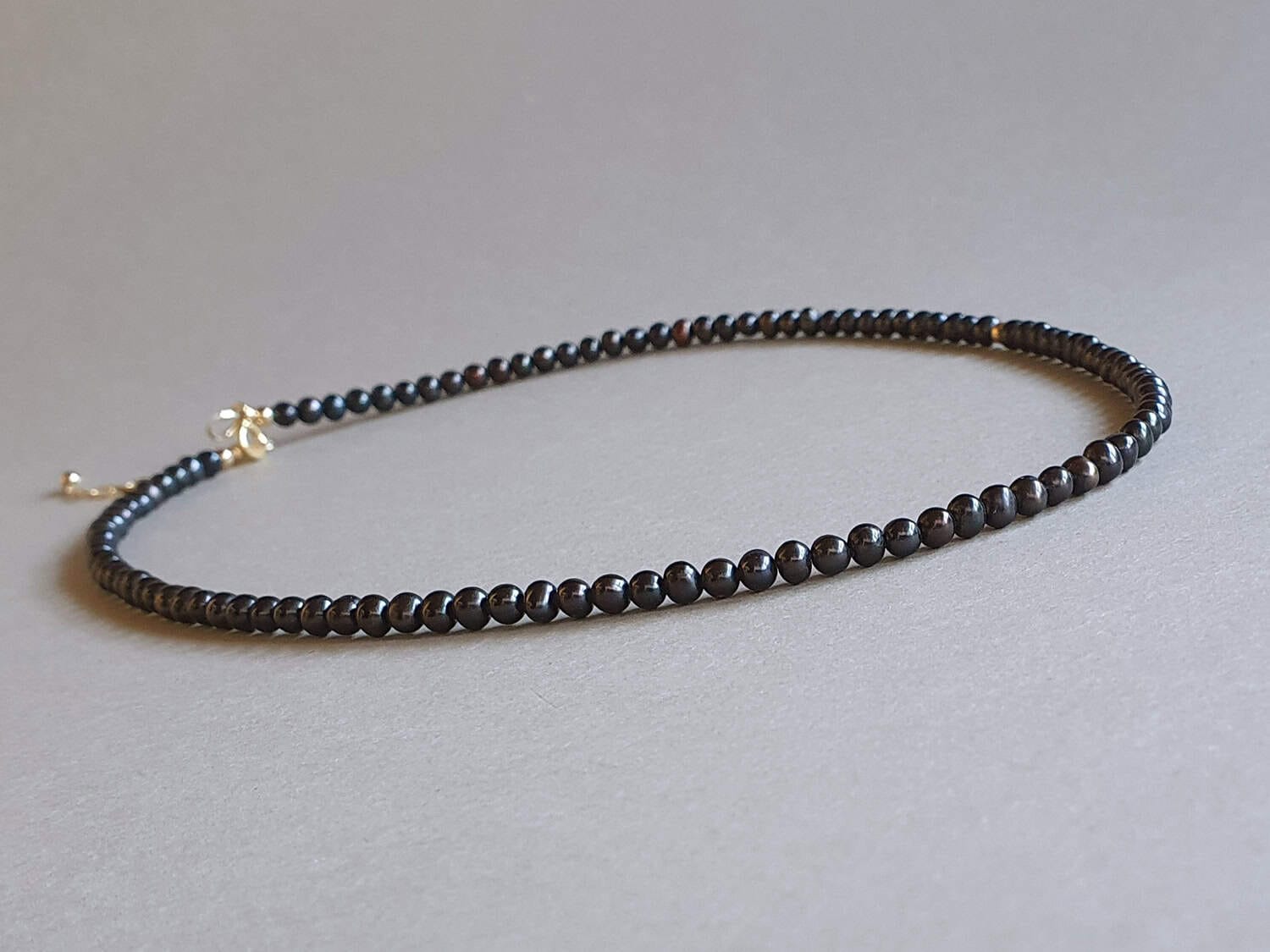 Colier realizat din perle de cultură negre de aproximativ 4 mm și elemente din aur filat. Lungimea colierului este variabilă; la plasarea comenzii vă rugăm selectați din meniu lungimea dorită. Disponibil și în varianta cu argint sau aur filat roz. Mai multe informații despre aurul filat găsiți aici. Mai multe informații despre perle găsiți aici.