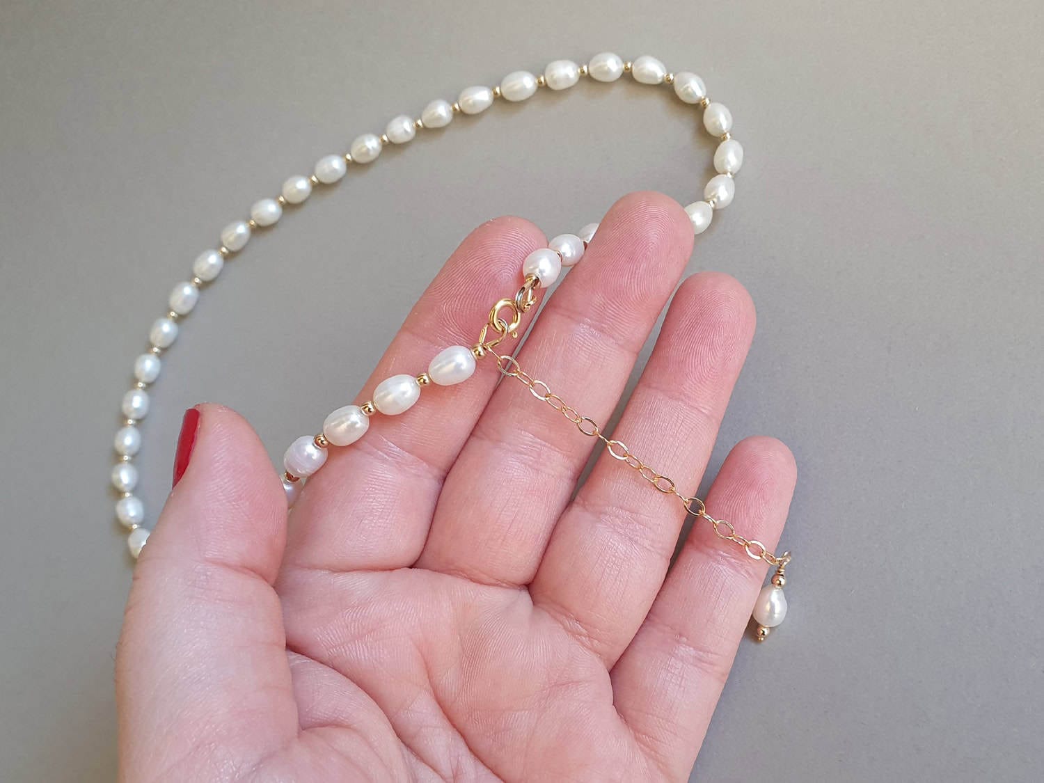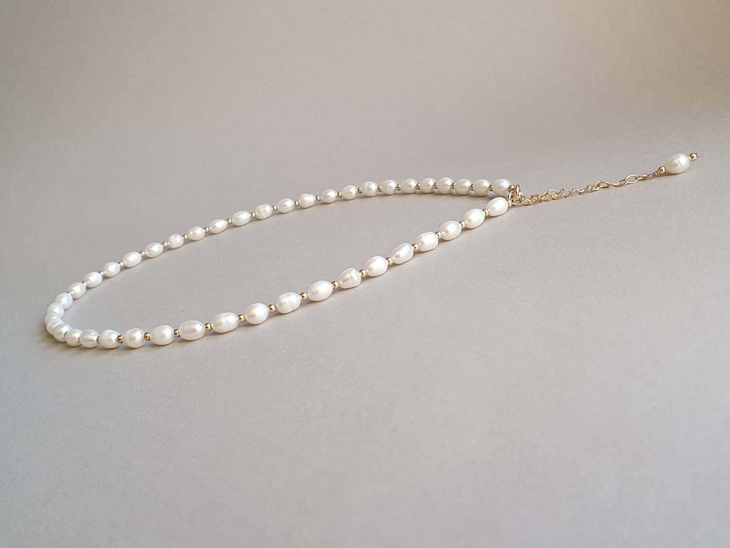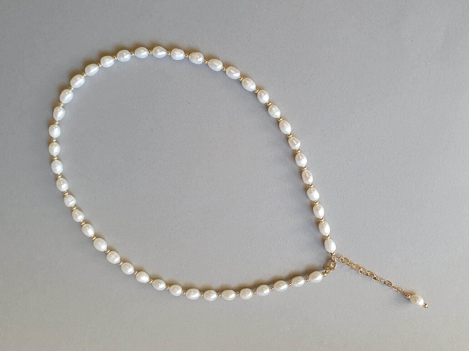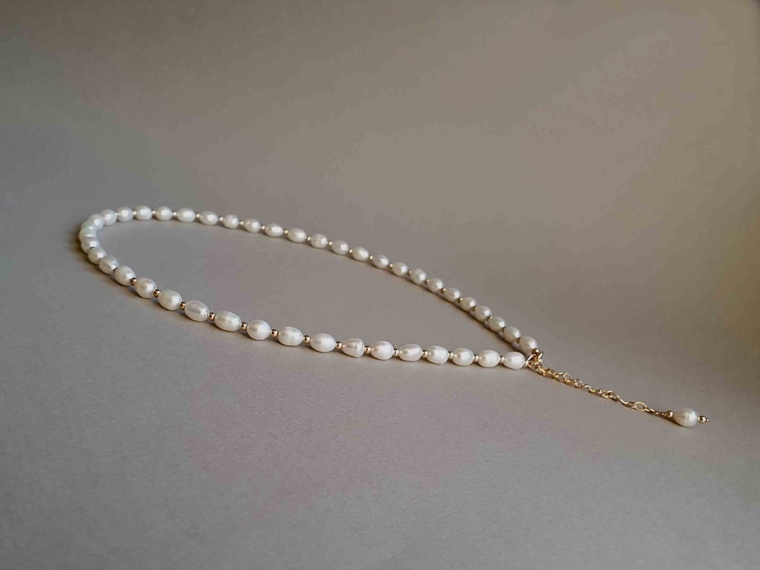 Colier realizat din perle de cultură de aproximativ 7×5 mm și elemente din aur filat. Lungimea colierului este variabilă; la plasarea comenzii vă rugăm selectați din meniu lungimea dorită. Colierul este prevăzut cu o prelungire de 7 cm. Disponibil și în varianta cu argint sau aur filat roz. Mai multe informații despre aurul filat găsiți aici.