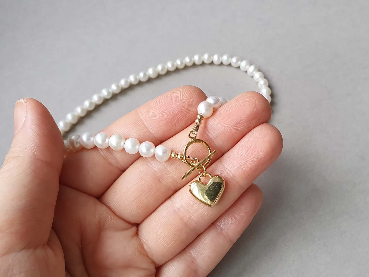 Colier realizat din perle de cultură de aproximativ 5-6 mm, elemente din aur filat și inimioara. Lungimea colierului este variabilă; la plasarea comenzii vă rugăm selectați din meniu lungimea dorită. Mai multe informații despre aurul filat găsiți aici.