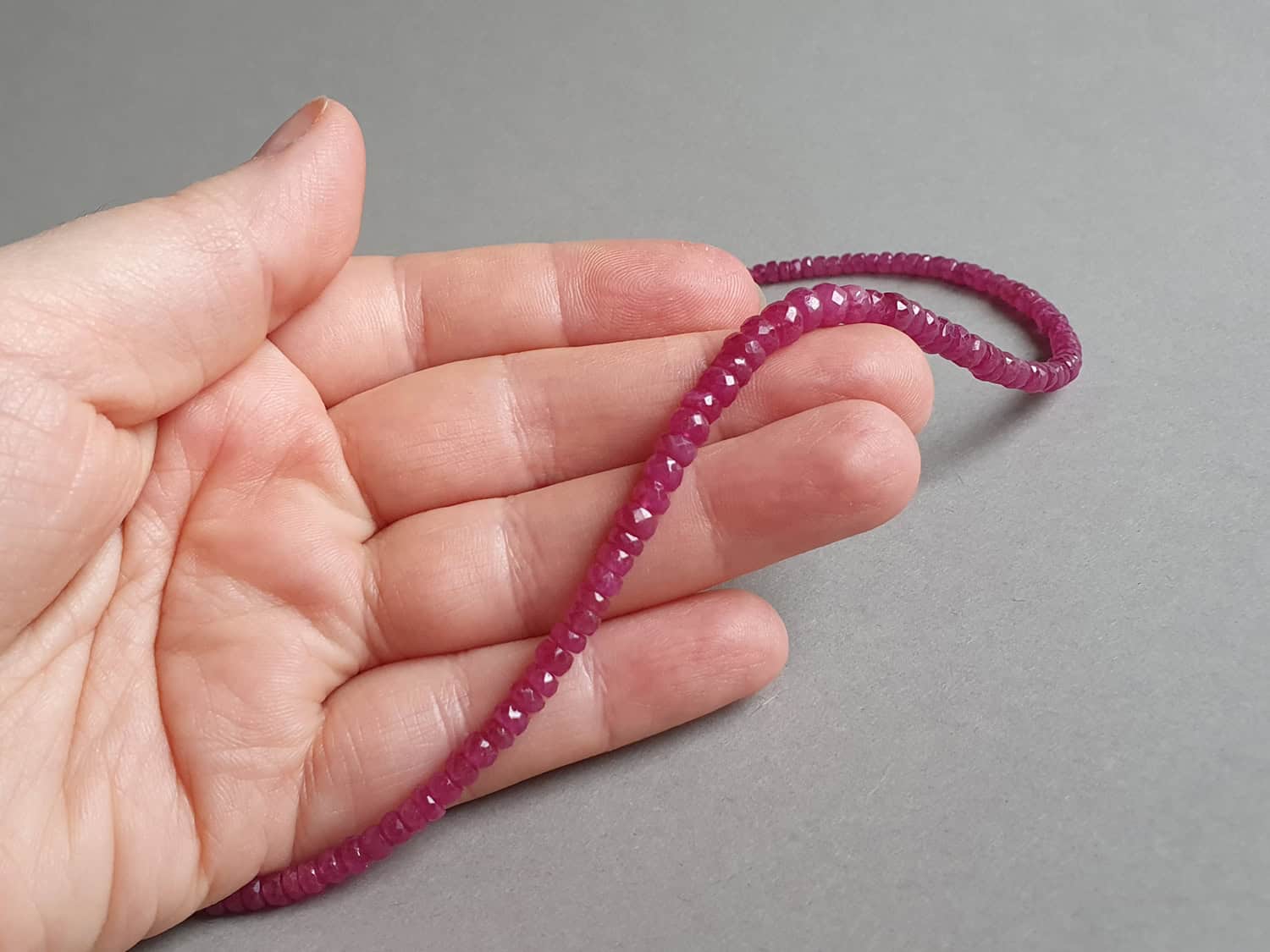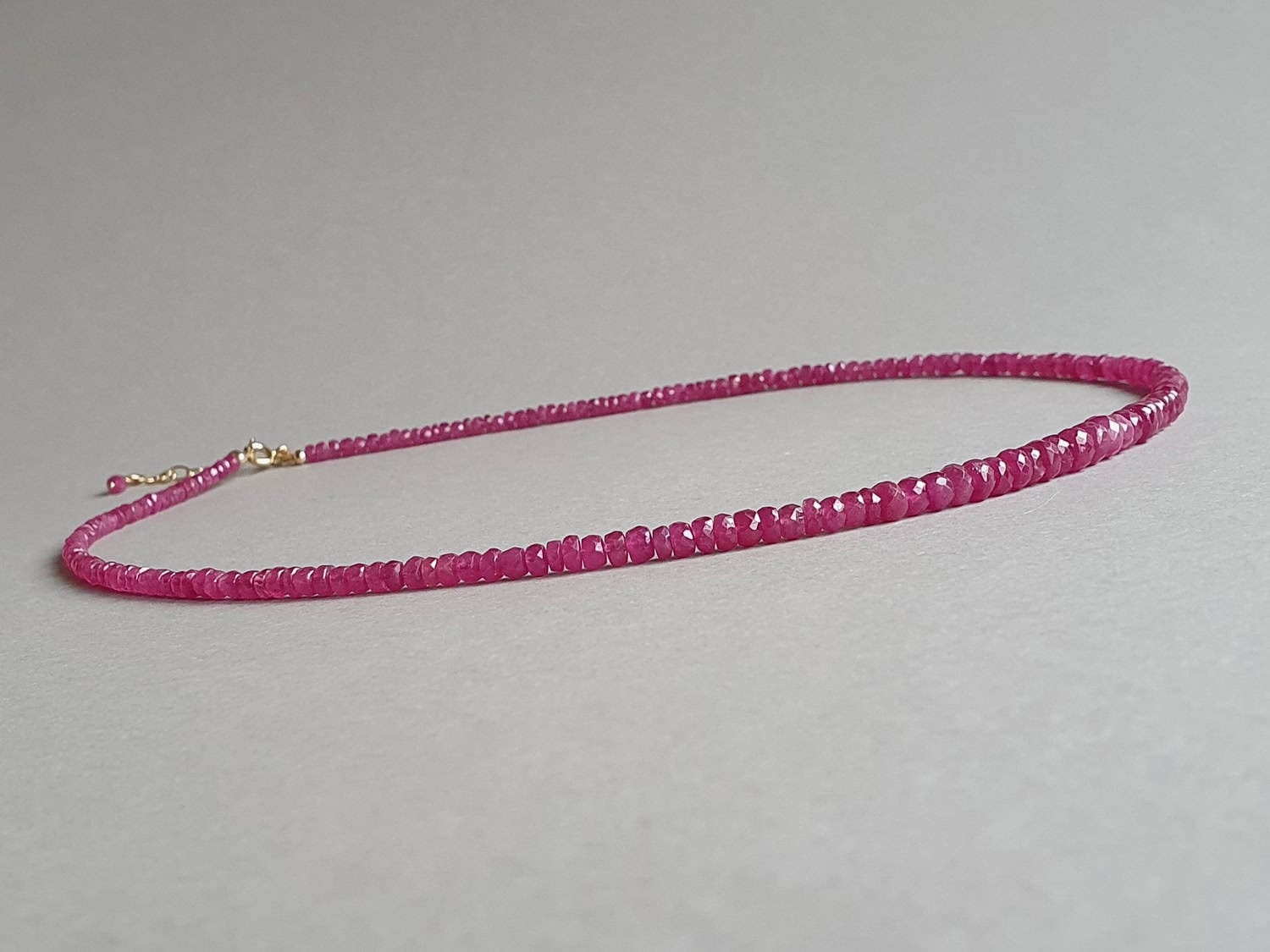 Colier confecționat folosind elemente din aur filat și rondele fațetate de 3-5 mm din rubin prețios, natural, netratat termic. Colierul este disponibil în trei lungimi – la plasarea comenzii vă rugăm să alegeți din meniu lungimea dorită. Prevăzut cu lănțișor prelungitor. Disponibil și în varianta cu argint sau aur filat roz. Mai multe informații legate de aurul filat (gold filled), aici.
