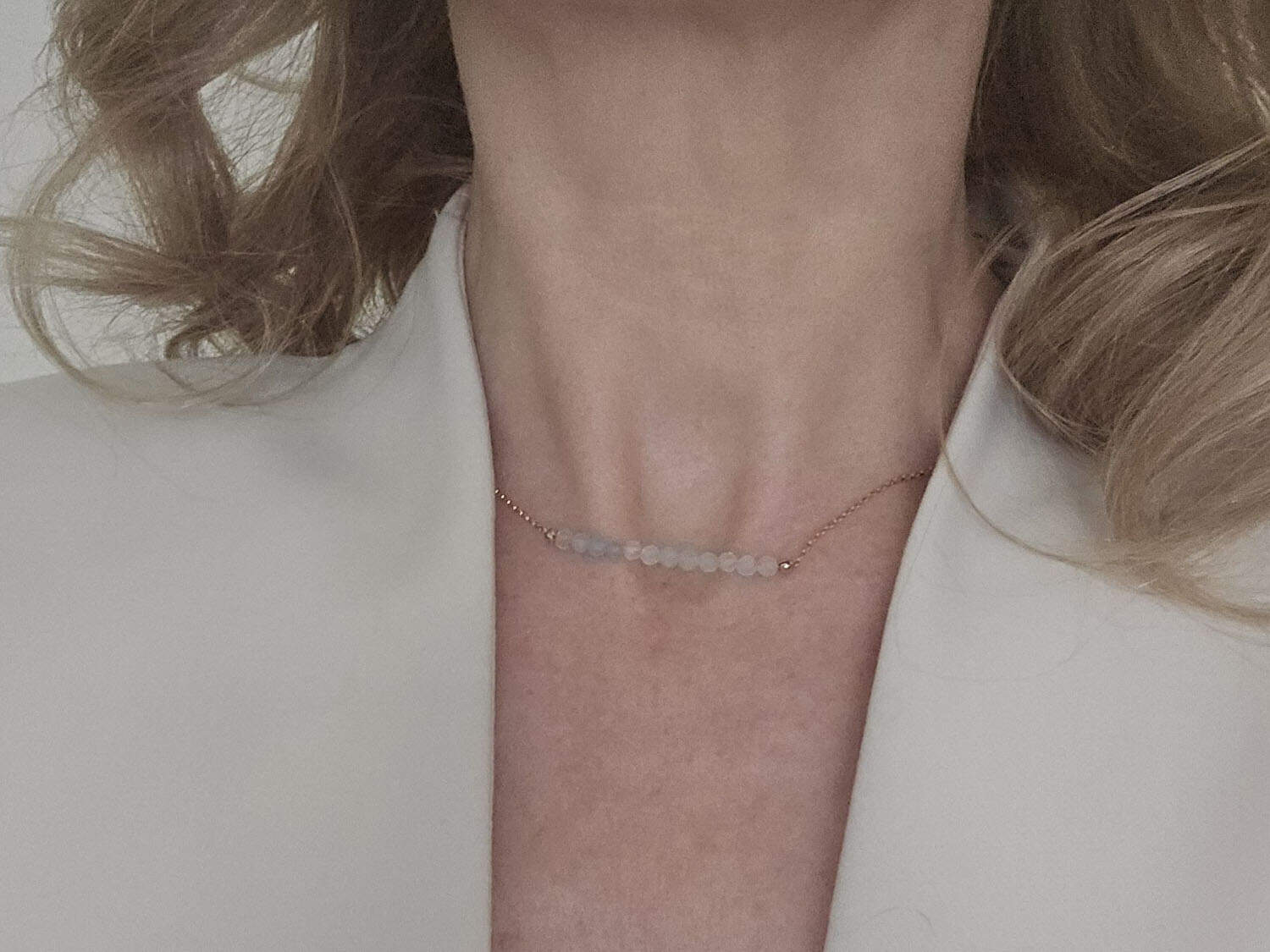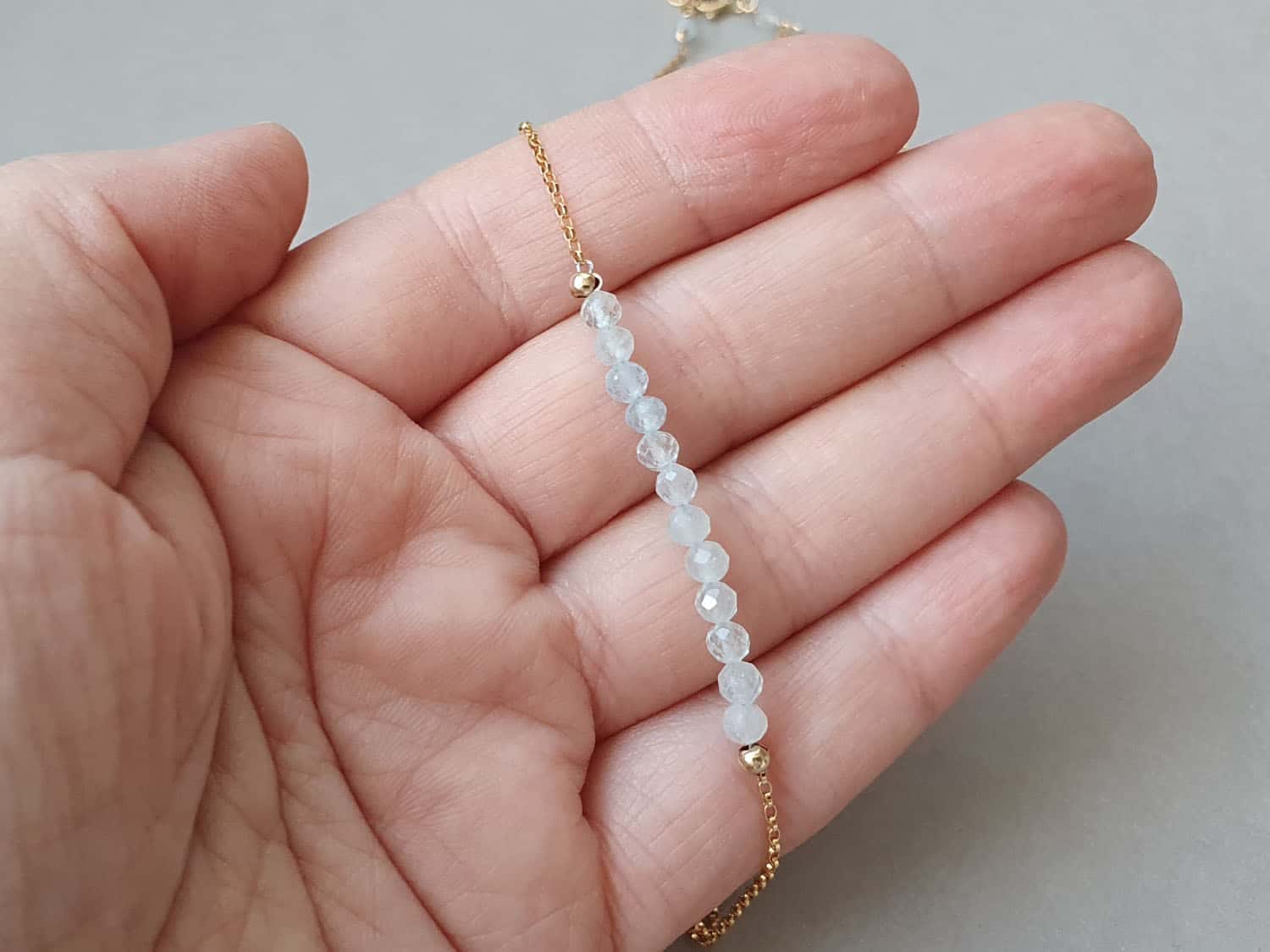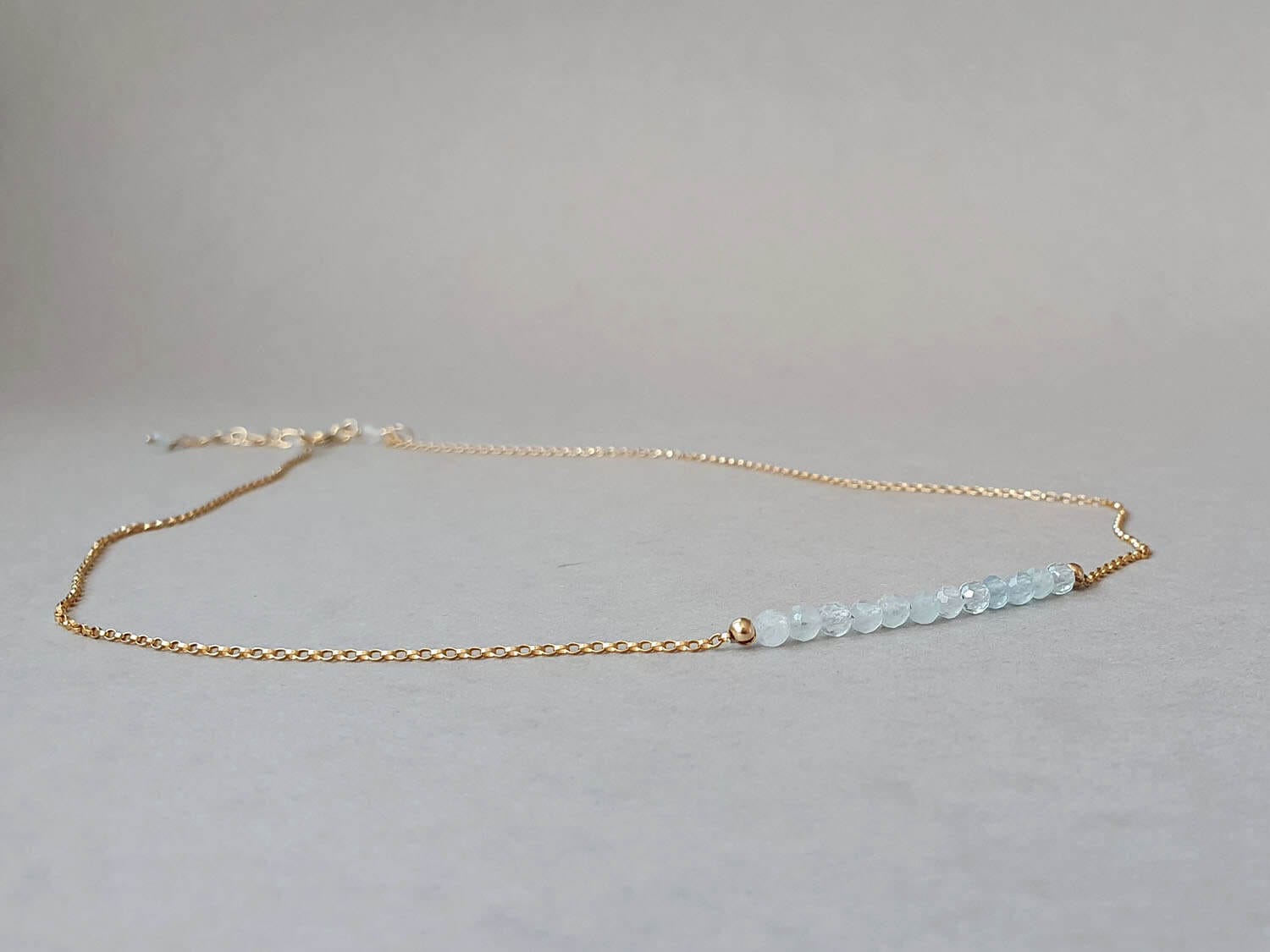 Colier minimalist confecționat din elemente din aur filat și rondele fațetate de aproximativ 3 mm din aquamarin natural, netratat termic. Colierul este disponibil în trei lungimi (la fiecare se adaugă un lănțișor prelungitor). Disponibil și în varianta cu elemente din argint sau aur filat roz. Mai multe detalii despre aurul filat găsiți aici.