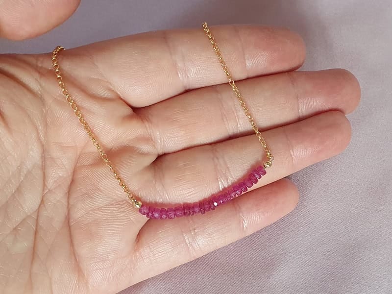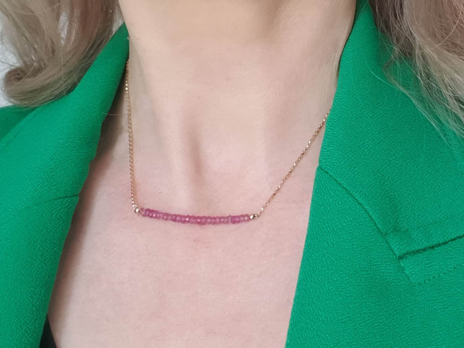 Colier minimalist confecționat folosind lanț și elemente din aur filat roz și rondele fațetate de 3-4 mm din rubin prețios, natural, netratat termic. Colierul este disponibil în trei lungimi – la plasarea comenzii vă rugăm să alegeți din meniu lungimea dorită. Prevăzut cu lănțișor prelungitor. Disponibil și în varianta cu argint sau aur filat galben. Mai multe informații legate de aurul filat (gold filled), aici.