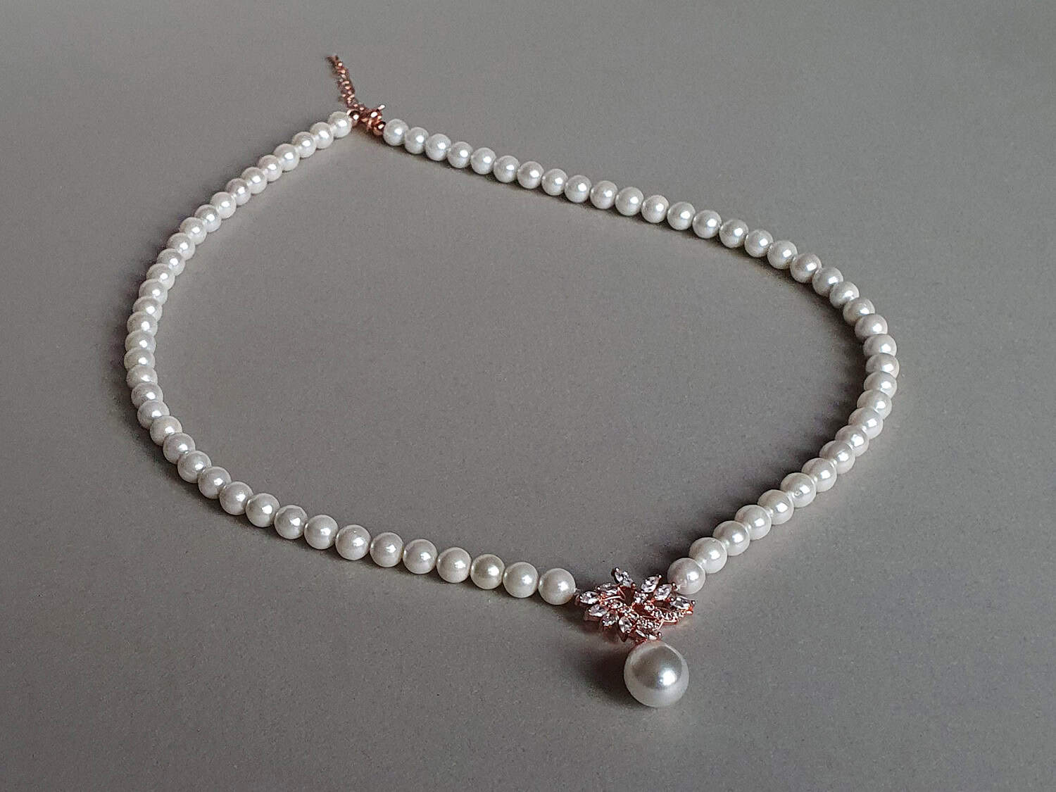 Colier placat cu aur roz, perle din sidef de 6 mm, cristale zirconiu cubic. Închizătoarea este din aur filat roz. Lungimea este variabilă; la plasarea comenzii vă rugăm selectați din meniu lungimea dorită. Lungimea colierului din imagini este de 36 cm. Cercei asortați pot fi achiziționați separat, aici. Disponibil și în varianta placată cu rodiu, aici. Mai multe informații despre perle găsiți aici.