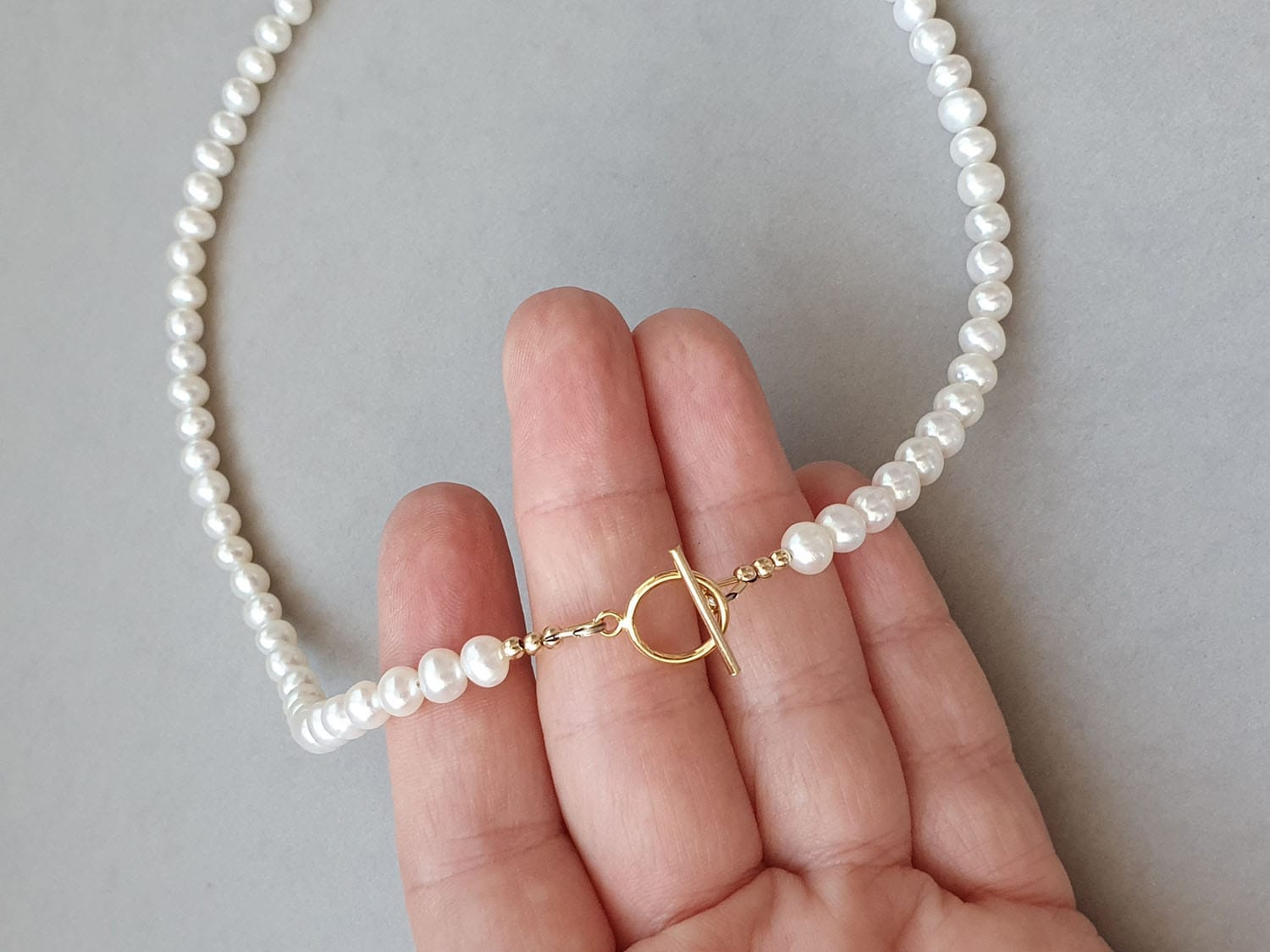 Colier realizat din perle de cultură de aproximativ 5-6 mm și elemente din aur filat. Închizătoare tip toggle. Lungimea colierului este variabilă; la plasarea comenzii vă rugăm selectați din meniu lungimea dorită. Mai multe informații despre aurul filat găsiți aici. Mai multe informații despre perle găsiți aici.