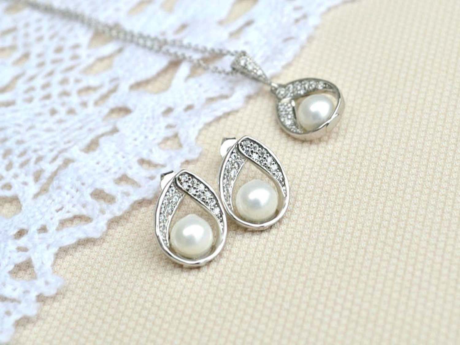 Set cercei și colier placat cu rodiu, cristale cubic zirconia transparente şi perlă din sidef. Tijele cerceilor sunt din argint. Perla are diametrul de 6 mm. Dimensiuni cercei : aproximativ 15 x 10 mm.