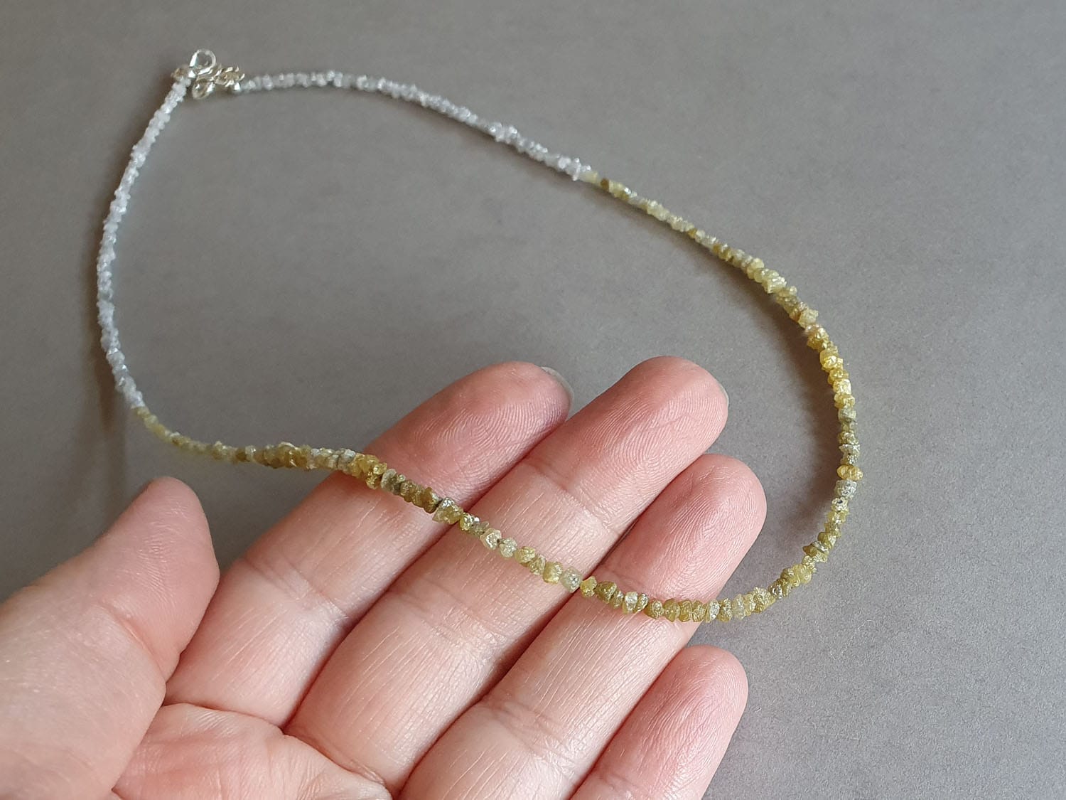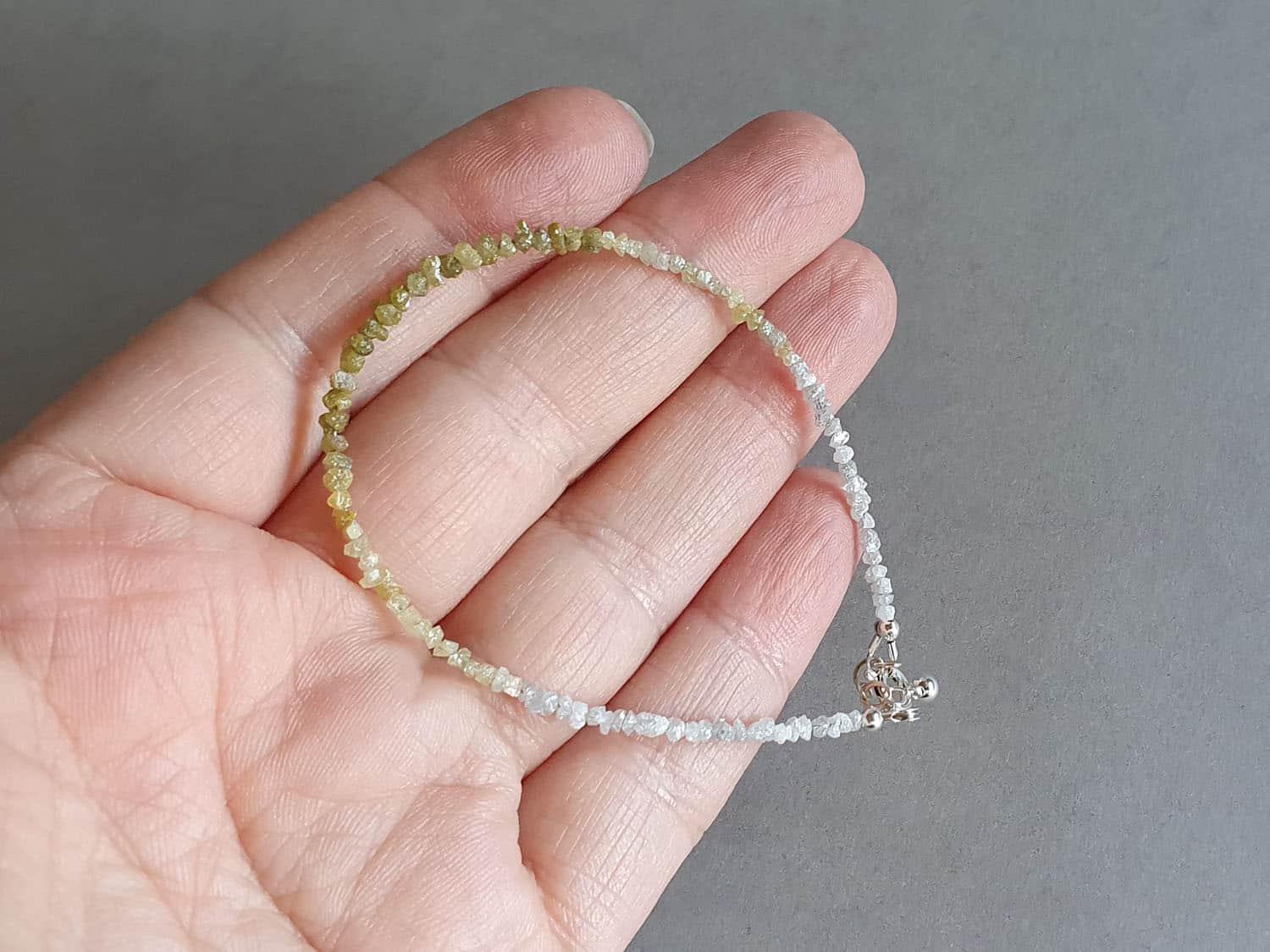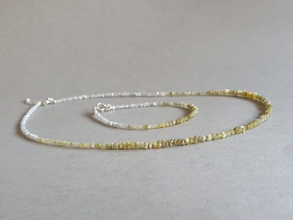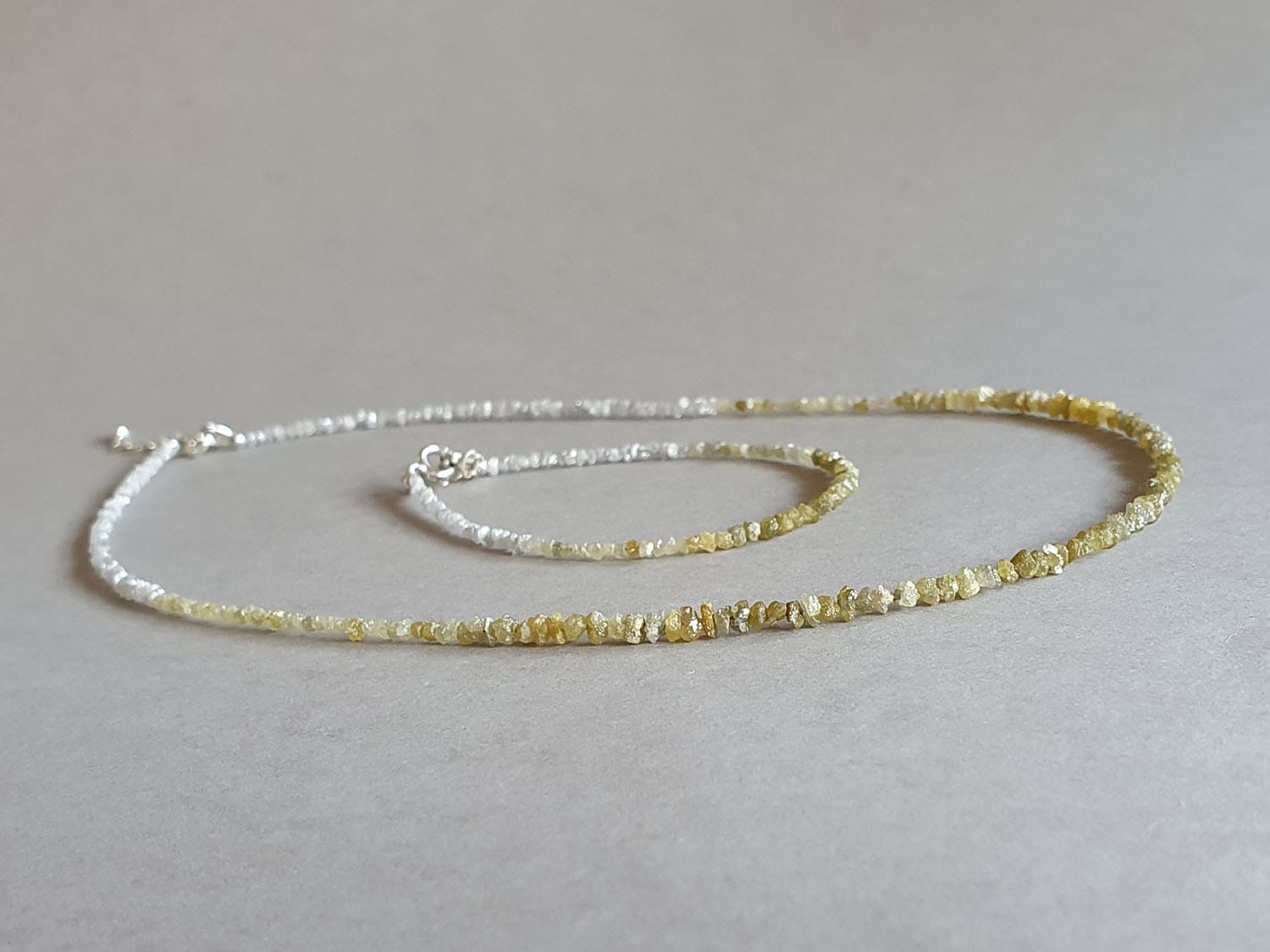 Colier și brățară confecționate din elemente din argint și diamante brute ombre (gri, galbene și verzi), cu dimensiuni între 2,5-2,9 mm Disponibile și în varianta cu elemente din aur filat, galben sau roz.