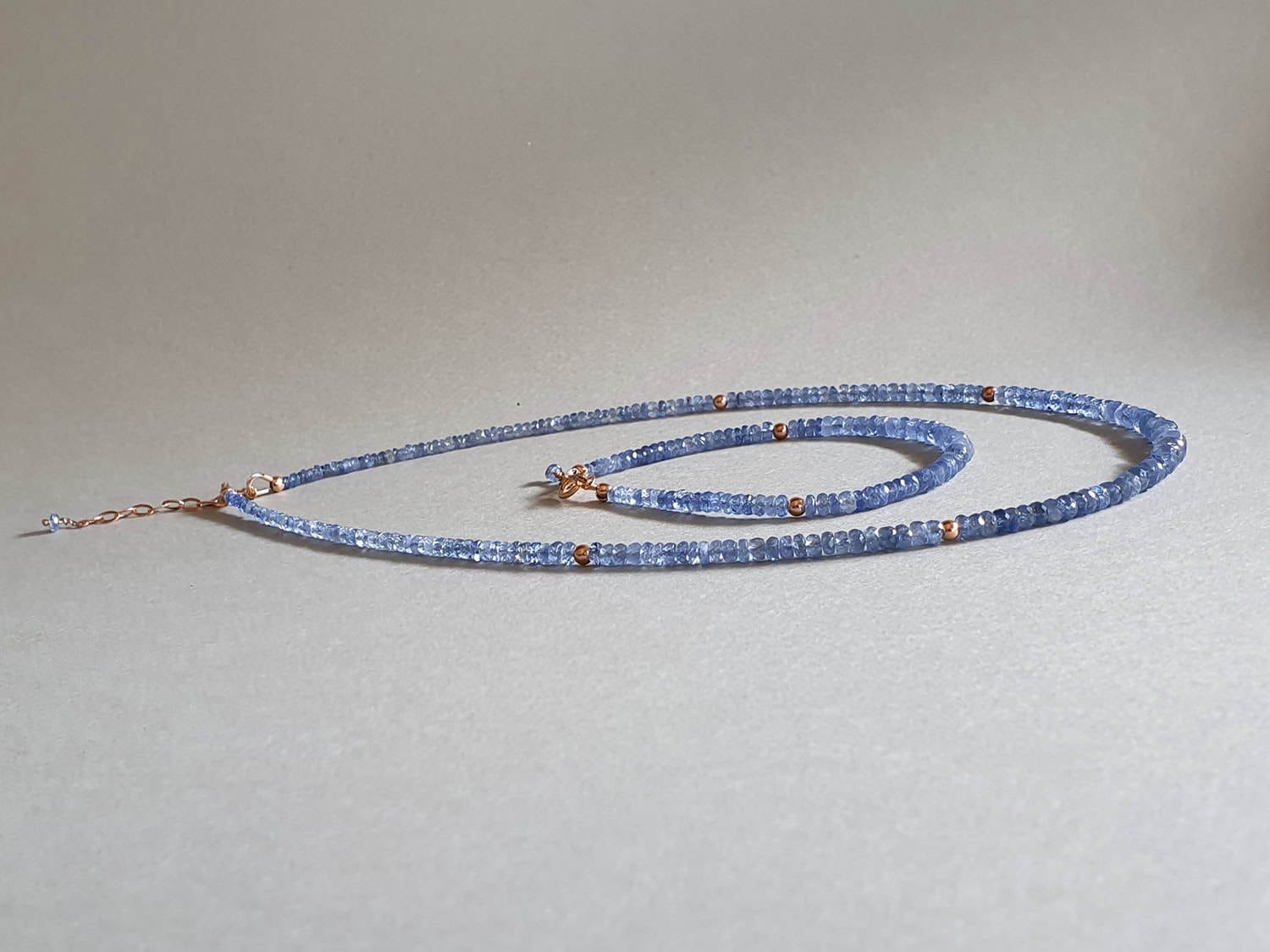 Colier și brățară confecționate din aur filat roz și rondele fațetate de aproximativ 4-5 mm din safir de Burma natural, netratat termic. Disponibile și în varianta cu argint sau aur filat galben. Mai multe informații despre aurul filat (gold filled) găsiți aici.