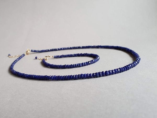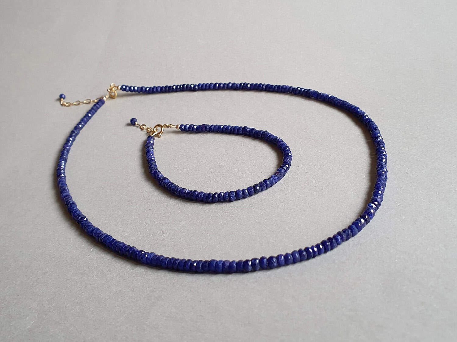 Colier și brățară confecționate din rondele fațetate de aproximativ 4 mm din safir rădăcină natural, vopsit și tratat cu ulei pentru intensificarea culorii și elemente din aur filat galben. Mai multe informații despre acest tip de safir găsiți aici. Disponibile și în varianta cu argint sau aur filat roz. Mai multe informații despre aurul filat (gold filled) găsiți aici.